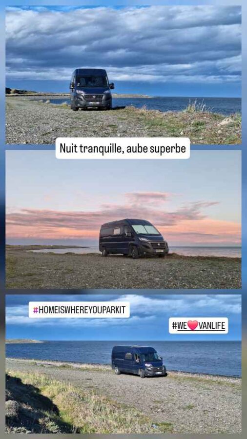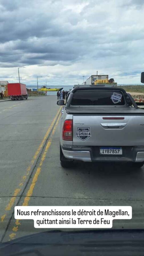 Après une traversée de frontière plus simple que prévu (papiers simples et rapides, inspection du véhicule a minima), nous voilà repartis sur les routes du Chili, mais pour de bon cette fois. Nous tentons un ravitaillement du frigo, laissé vide pour la douane, à Cerro Sombrero, la première ville rencontrée sur notre parcours, mais les deux mini-mercados, de la taille d’une maisonnette sont fermés en ce milieu d’après-midi. Ils n’ouvrent que de 18 à 20 heures, de vrais mini-horaires assortis à leur taille ! Et puis nous refranchissons dans le même bac gratuit qu’à l’aller le détroit de Magellan, sous la pluie. Peu de risque que la Terre de Feu s’embrase aujourd’hui. Nous quittons cette grande et superbe île pour le Chili continental, longeant d’abord la rive nord du détroit. La pluie se calme mais nous en avons assez pour aujourd’hui : nous nous garons pour la nuit près d’une plage de galets. Isolés du vent et du bruit de la route par une petite butte, c’est parfait. Nous aurons de plus la chance de voir un tatou. Ça court vite ces bêtes-là ! Le temps de sortir mon téléphone, il m’a fallu le courser pour le rattraper et le prendre en photo, de quoi enrichir notre collection faunique patagonne.