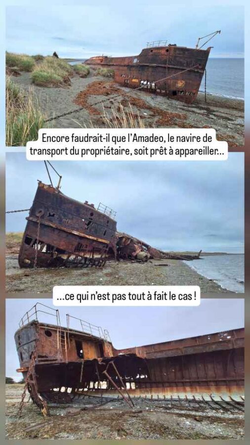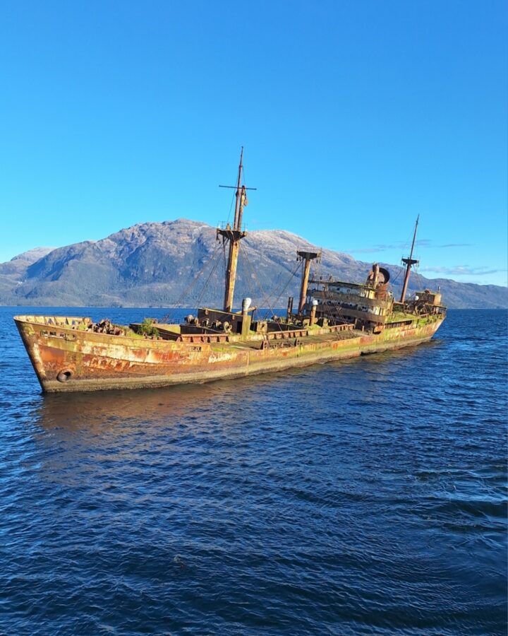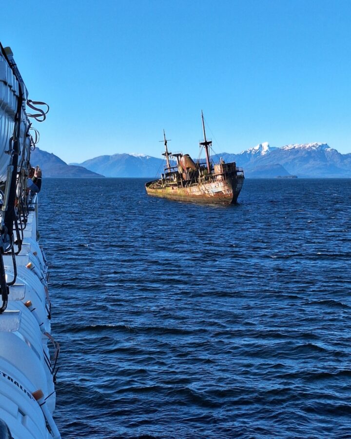 A un moment, le Crux Australis ralentit nettement. Un navire s’approche en sens inverse. Et plus il se rapproche, plus il a une allure bizarre. A la fois rouillé et couvert de mousses et de végétation dense, c’est presque un bateau fantôme que nous allons frôler… Lorsque nous sommes tout près, notre ferry se met au ralentit pour que nous observions mieux cette véritable épave, dont nous apprenons bientôt l’histoire étonnante.