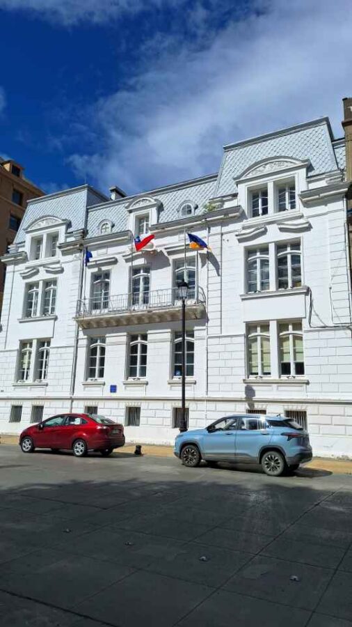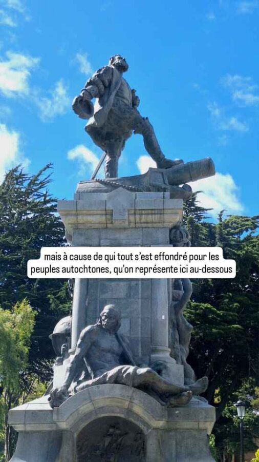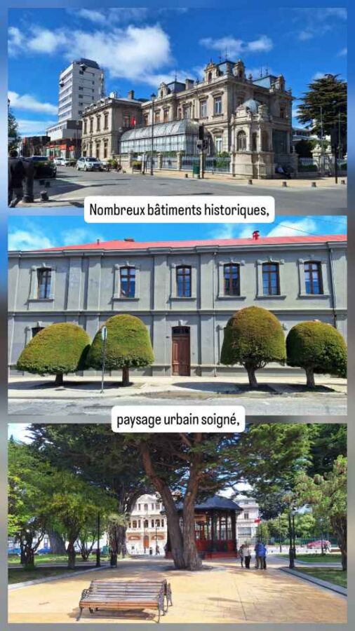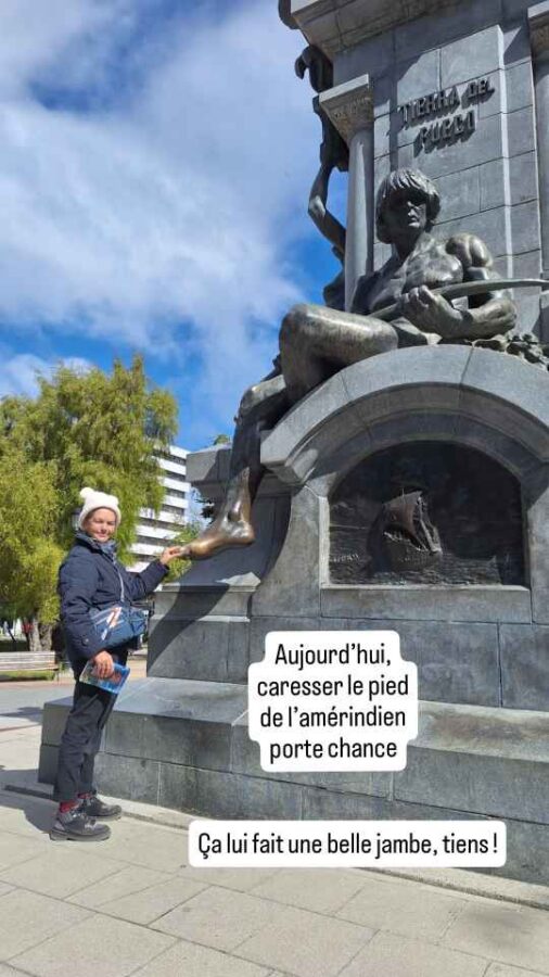 Cette ville est le pendant chilien d’Ushuaïa en Argentine mais – c’est une opinion personnelle – en mieux. Là où l’architecture argentine était terne, nous avons plaisir à retrouver des couleurs et quelques bâtiments historiques. La tôle ondulée et le bardage bois semblent être la règle, au moins dans le sud du Chili, mais au moins c’est coloré ! Sur le boulevard côtier de Punta Arenas, la Costanera, on trouve une statue d’un capitaine chilien ayant sauvé un bateau expéditionnaire brisé par les glaces, des pontons qui ne sont plus accessibles qu’aux oiseaux de mer, et diverses œuvres d’art. Le port est très actif, bien que son activité ne soit plus aussi florissante depuis la mise en service du canal de Panama qui a détourné une grosse partie du trafic du détroit de Magellan. Le centre-ville comporte pas mal de bâtiments historiques de style, souvent des demeures des premiers (et riches !) commerçants de la laine ou de la viande ovine, mais aussi des édifices religieux comme la cathédrale du Sacré-Cœur, reconstruite en briques quelques années après que la version initiale en bois ait totalement brûlé en 1892 quatre mois seulement après son inauguration. Eh les gars, vous aviez pensé que les fidèles allaient forcément allumer des cierges ?! Au centre de la place principale trône une statue de Magellan, grâce à qui tout a commencé pour les colons européens mais à cause de qui tout a foutu le camp pour les autochtones qui vivaient paisiblement dans la région. Symboliquement, Magellan situé en haut de l’édifice est hors de portée des passants, mais caresser le pied de l’indien Selk’nam représenté au-dessous porte chance. Ça lui fait une belle jambe, tiens !