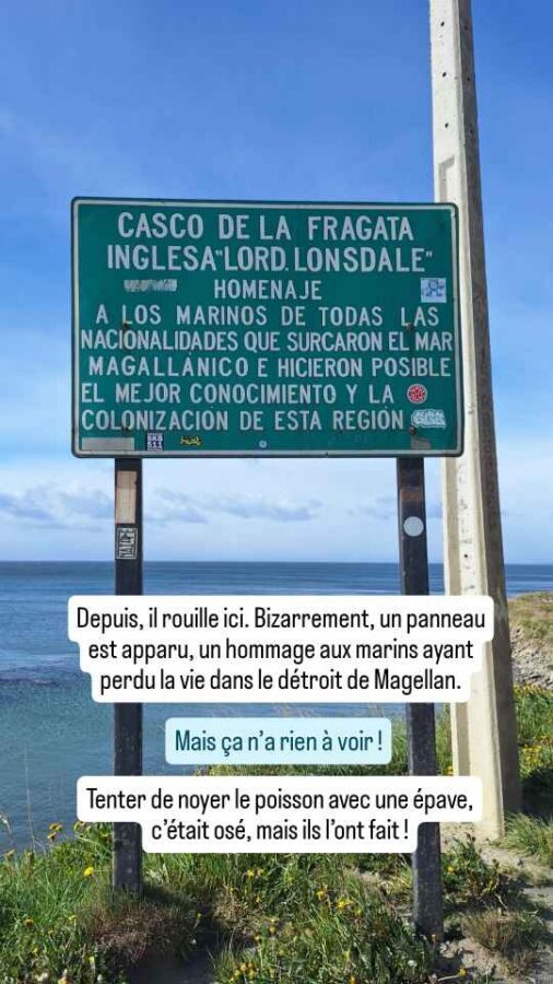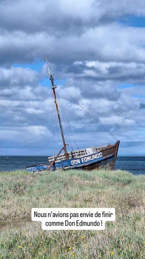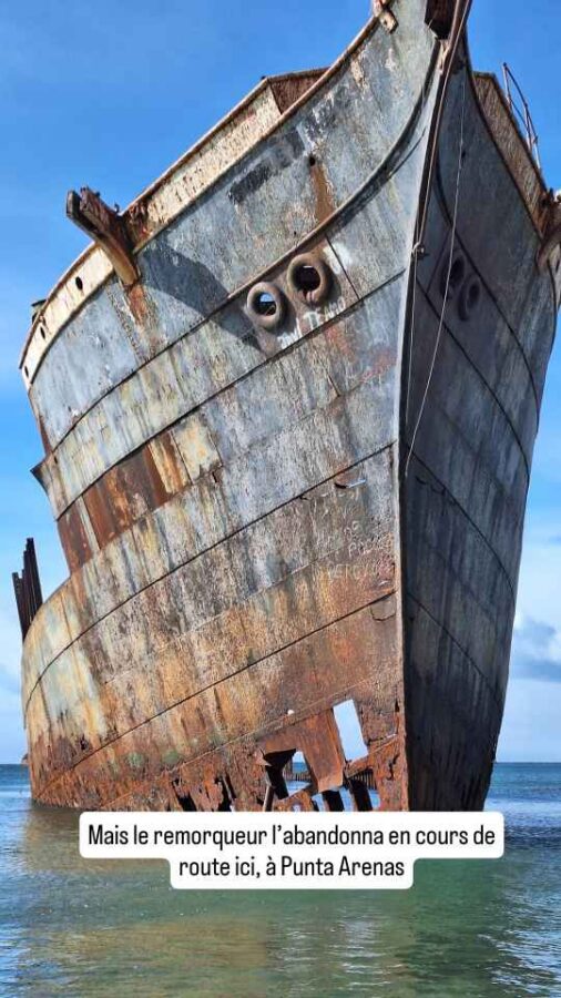 Jamais nous n’avions vu autant d’épaves qu’en Patagonie, même sans s’approcher du Cap Horn dont la réputation est terrible à ce sujet. Près d’un quartier sud de Punta Arenas, c’est la silhouette rouillée de la frégate anglaise Lord Lonsdale, un trois-mâts en acier, qui barbote dans l’eau tout près de la route. De son port d’origine Hambourg à sa destination Mazatlán, sur la côte ouest du Mexique, ce navire n’avait d’autre solution en 1909 que de passer par le détroit de Magellan. En escale aux Malouines, il a pris feu, et n’est plus restée que la coque. Il a finalement été remorqué jusqu’ici pour finir ses jours à la plage. Beaucoup de gens rêvent de faire pareil, vous savez.
