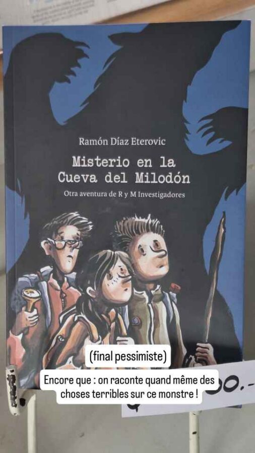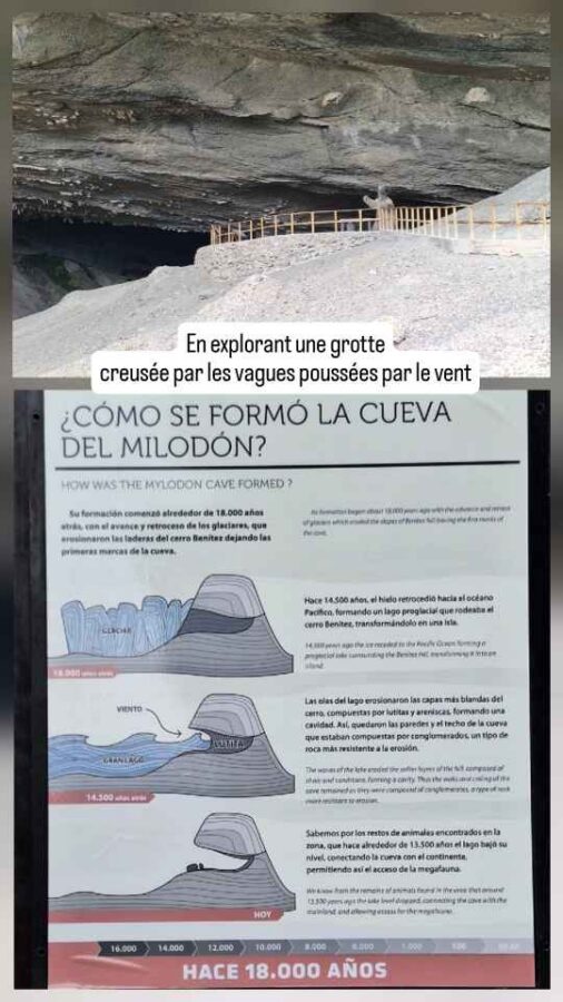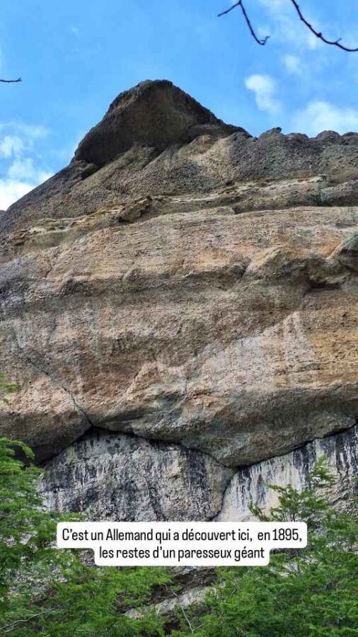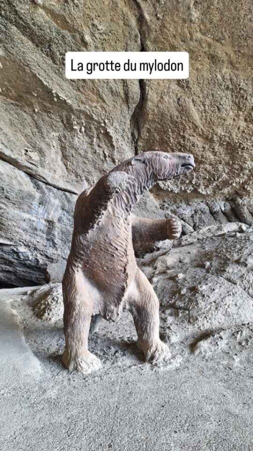 C’est un Allemand qui a découvert en 1895, dans une grotte creusée par les vagues poussées par le vent, les restes d’un paresseux géant de 4 mètres de hauteur. Une reconstitution grandeur nature est d’ailleurs placée à l’entrée de la grotte. C’est mieux pour éveiller l’imaginaire que de contempler une phalange, un tibia et une crotte (oui, ça faisait partie des restes retrouvés !) vieux de plusieurs dizaines de milliers d’années. L’animal, un paisible herbivore a disparu il y a 10 à 12 000 ans à cause du réchauffement climatique (fin d’une période de glaciation !) et peut-être de l’appétit des premiers humains arrivés dans la région.