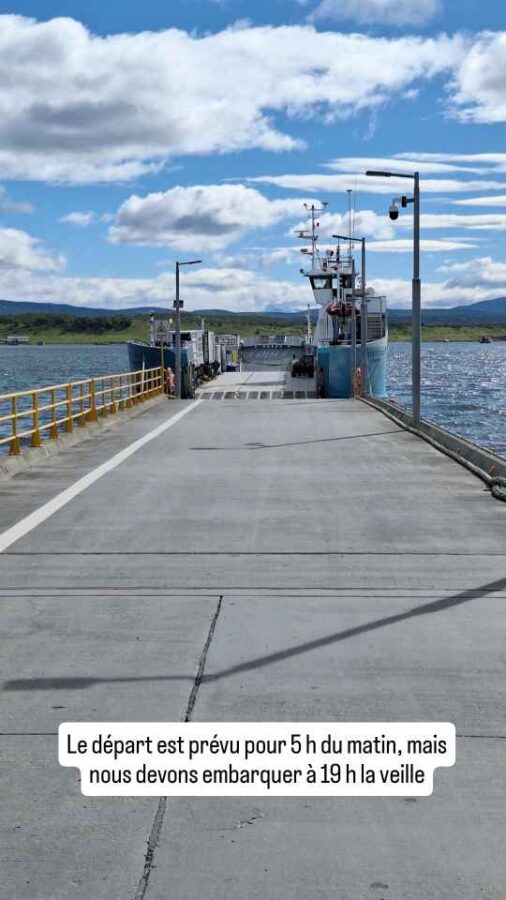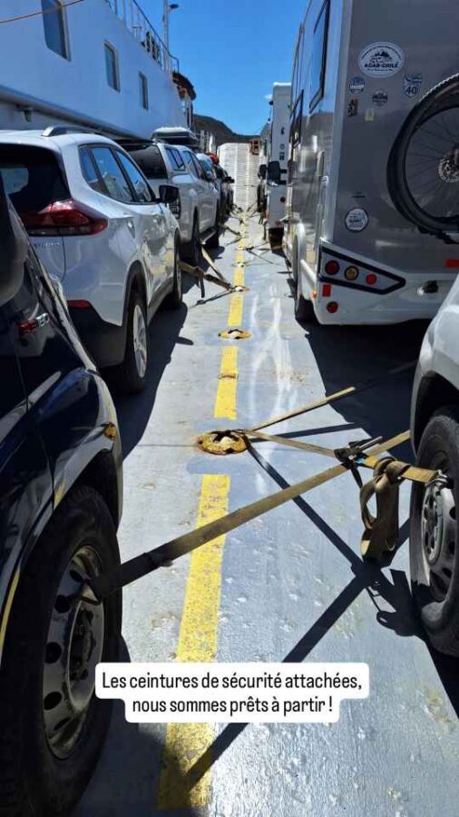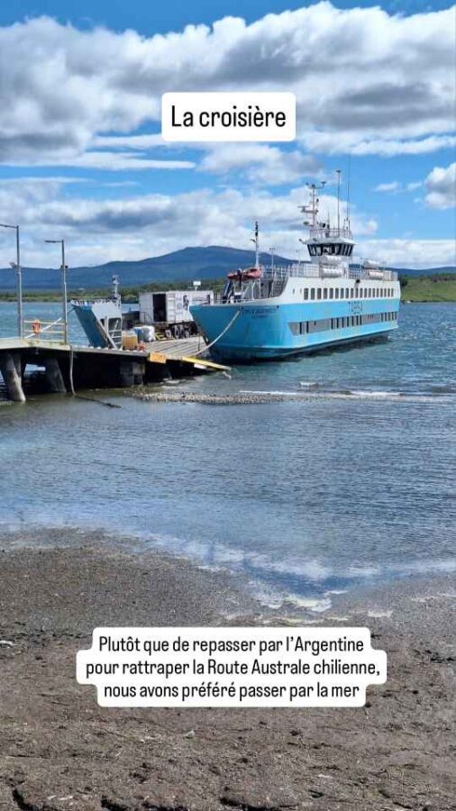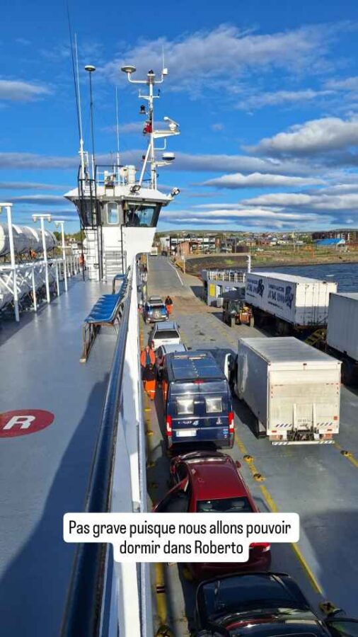 Nous avions réservé plus d’un mois auparavant notre passage sur le Crux Australis, dont les départs ne se font que tous les 5 à 7 jours selon la saison. Le trajet dure 3 nuits et 2 jours. Il n’y a pas de cabines individuelles mais une grande salle aux sièges très inclinables pour les passagers. Le gros plus pour nous est que nous pourrons dormir dans Roberto. Nous embarquons à 18h30 pour un départ prévu à …5h du matin.