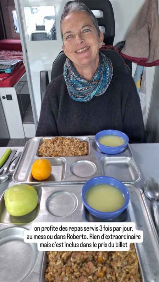 Après, eh bien c’est une vraie petite croisière. Le bateau circule dans de larges canaux entourés de montagnes aux sommets enneigés. Le spectacle est permanent. Le ciel est un peu gris le premier jour mais se découvre le second. Nous sommes nourris 3 fois par jour. Le personnel est aux petits soins. Nous avons largement le temps de discuter avec quelques passagers, dont un couple de Français de notre âge qui circule en voiture de location pour 1 mois. Et puis avec d’autres voyageurs, dont plusieurs circulent en véhicule de loisirs comme nous.