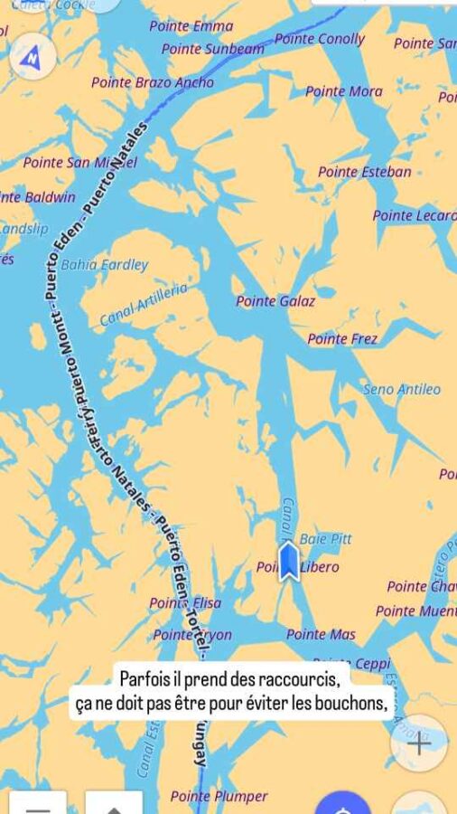 Si nous sommes venus à Puerto Natales, c’est surtout parce que c’est le terminus sud des lignes de ferry circulant dans les fjords chiliens. Et une ligne nous intéresse particulièrement, c’est celle qui va nous conduire 700 km plus au nord à Puerto Yungay. De là, nous pourrons emprunter cette longue route de 1240 km qu’est la Carretera Austral, réputée magnifique en termes de paysages. Nous aurions pu la rejoindre plus haut en repassant par l’Argentine et beaucoup d’endroits que nous avions déjà vus, mais ça aurait été dommage.