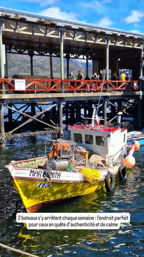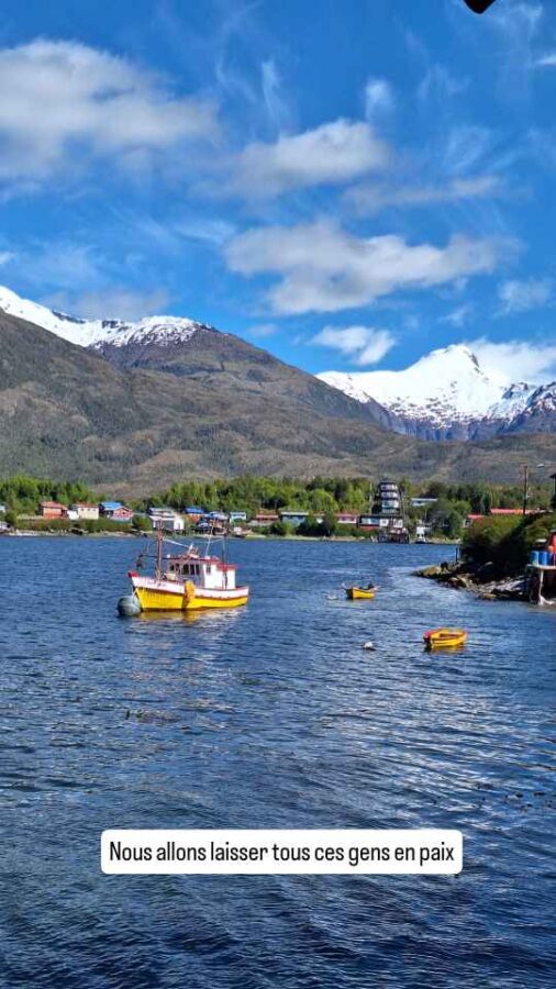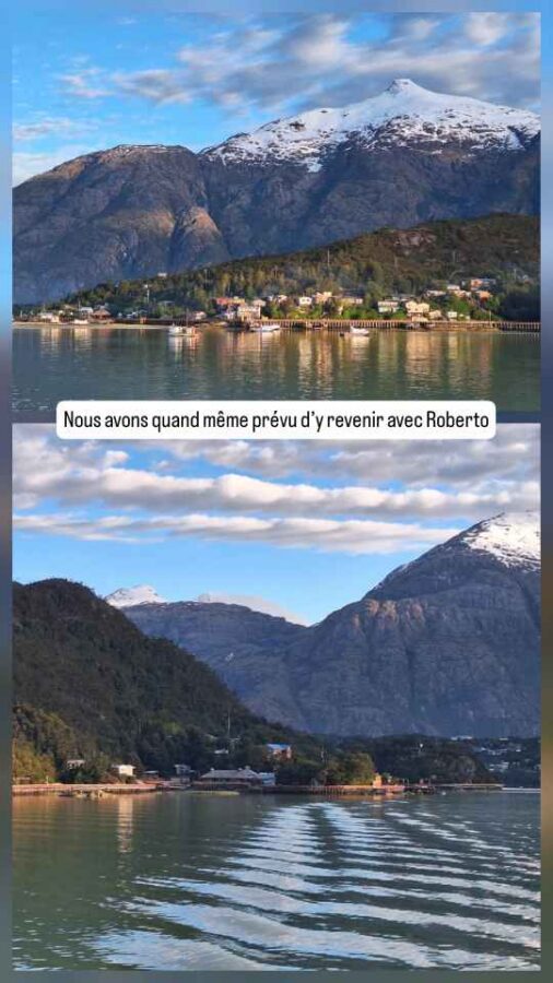 Et puis, après encore quelques méandres dans ces magnifiques canaux chiliens, nous découvrons au détour d’une pointe de végétation une minuscule crique au fond de laquelle nous attendent une rampe de débarquement en ciment quelques hangars. Mais pas de maison. Puerto Yungay ne doit son existence qu’au fait d’être raccordé à la Carretera Austral, la plus célèbre route du Sud du Chili. Alors que nous nous réjouissons de débarquer et de circuler sur cette route mythique, Roberto refuse tout simplement de démarrer et de quitter le navire !
