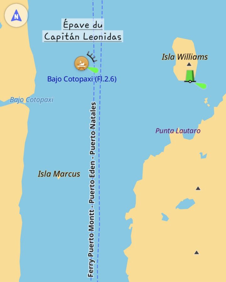 Construit en 1937, vaisseau de guerre sous pavillon norvégien pendant la Seconde Guerre Mondiale, puis cargo plus tranquille, ayant changé plusieurs fois de nom et de propriétaire, ce navire est devenu le Captain Leonidas en décembre 1966 tout en battant pavillon grec. Il avait pour mission en avril 1968 de transporter du sucre de Santos au Brésil à Valparaiso au Chili. Sa route passait par le détroit de Magellan puis, comme nous dans cette croisière, par le canal de Messier dans les fjords chiliens. A un endroit qui fait 5 km de large, où il avait pourtant largement la place, il s’est échoué sur un haut-fond situé juste au milieu et connu depuis longtemps, dûment signalé par une balise. C’est là que nous l’avons croisé. L’enquête initiale a conclu à une erreur de pilotage, mais la compagnie d’assurances a eu des doutes. Son enquête a montré que, non seulement le sucre aurait été livré ailleurs avant l’accident, mais qu’en outre le capitaine du navire volontairement jeté ce dernier sur des hauts-fonds pour toucher la prime à la fois sur le bateau et sur la cargaison. Les deux, mon capitaine !