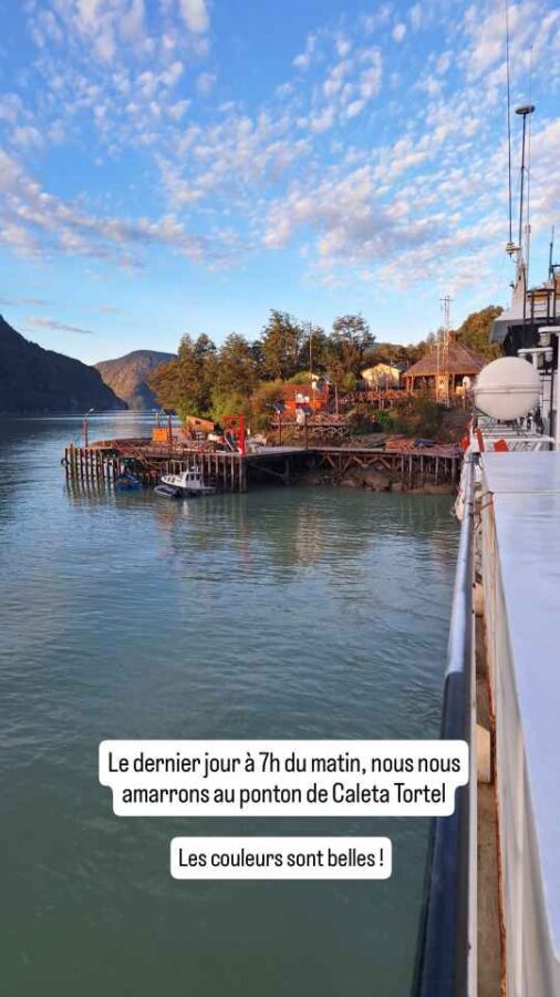 A 7 heures du matin le lendemain, avec un éclairage sublime, nous atteignons notre seconde escale, Caleta Tortel. Un autre petit village de pêcheurs, dont les maisons sont construites comme le précédent sur pilotis et reliées entre elles par des passerelles en guise de routes. Mais Caleta Tortel est reliée au reste du Chili par une piste accessible aux voitures. Bien évidemment, cela a créé un afflux de touristes, réduit l’authenticité en même temps que l’isolement. Pas de débarquement possible pour Roberto, mais nous avons prévu d’y revenir par la route.
