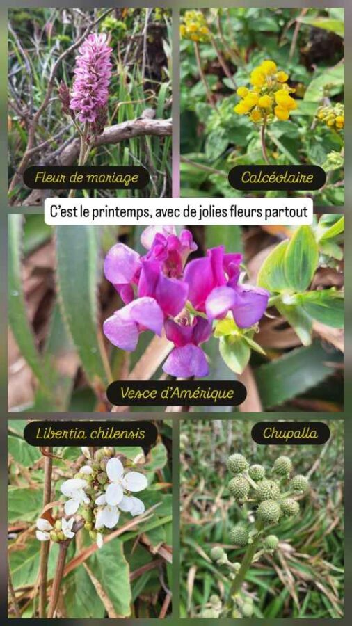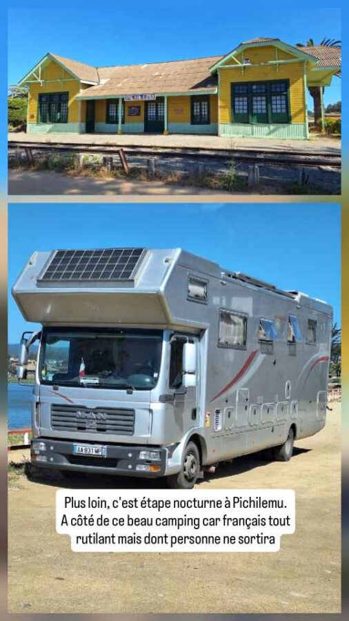 Poursuivant notre route côtière vers le Nord, nous allons côtoyer d’autres formations rocheuses, sculptées par dame nature et parfois peintes par les oiseaux qui s’y nichent. Une côte belle et sauvage, dont le sable gris foncé effraie peut-être les touristes, bien moins nombreux que les oiseaux. Plus loin, la route fait un crochet dans l’intérieur des terres, mais la mer se rappelle toujours à nous sous forme de marais salants. Celui que nous allons voir, près de Lo Valdivia, est l’un des deux derniers en activité dans la région qui en comptait pourtant beaucoup au début du XXe siècle, à son pic d’activité. Un joli damier blanc et mauve s’étend sous nos yeux avec des sauniers cheminant le long des murets : manifestement, c’est la saison de la cristallisation. La récolte aura lieu dans quelques mois, au cœur de l’été, et d’ailleurs les stands de vente sont encore vides. Un peu après Bucalemu, la grande ville suivante, Roberto franchit le cap des 150 000 km. Et avec nous 55 mois de vie nomade, ce qui fait une moyenne de 2 727 km par mois ! Nous terminons la journée pas loin d’une plage à Pichilemu, et presque côte à côte avec un camping-car de compétition français (le premier véhicule français que nous rencontrons depuis Buenos Aires). Aucune inscription sur l’extérieur, personne n’est descendu de la soirée ou du début de matinée, pas de bruit… Nous n’en saurons pas plus. La ville elle-même n’a rien d’exceptionnel. En s’y baladant nous trouvons une mignonne petite gare ferroviaire (reconvertie en musée) et beaucoup de buissons de roses, grimpants ou tombants. Et puis une fleur qui m’intrigue. Google Lens l’identifie comme passiflore, la fleur de la passion. Mais pourquoi ce nom ? Et y a-t-il un lien avec le fruit de la passion ? Vous en saurez davantage au chapitre suivant.