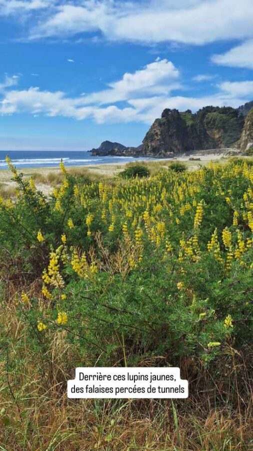 C’est au niveau de la ville de Lebu que nous rejoignons l’Océan Pacifique. Nous avons évité la cité elle-même, une ancienne ville minière très industrieuse et réputée sans charme, pour nous garer au bord de la Playa Grande, située un peu au nord. Une jolie plage de sable clair, presque déserte en cette fin de printemps, mais magnifiquement bordée d’un champ de lupins jaunes. Nous ne nous y sommes pas baignés, le vent frais et la basse température de l’eau nous en ayant dissuadés. Mais l’environnement était propice à la randonnée du côté des falaises qui s’avancent dans la mer. Elles sont même percées de tunnels naturels d’une centaine de mètres de longueur qui permettent de gagner la Playa Chica de l’autre côté, plus petite comme son nom l’indique mais plus sauvage que la première.