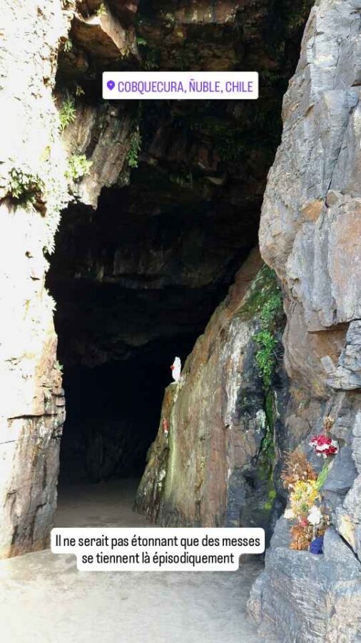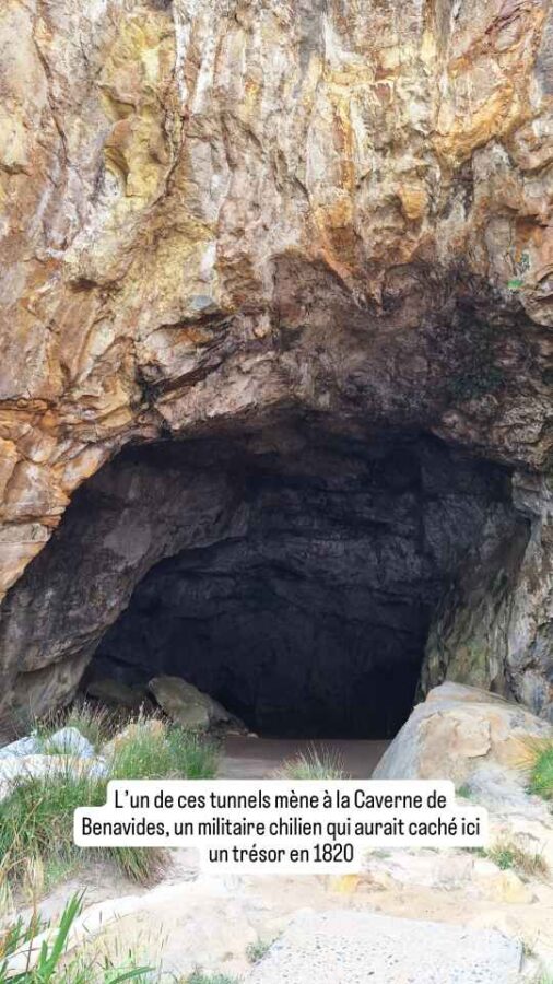On voit parfois sortir de ces tunnels des hommes poussant des brouettes chargées d’algues qu’ils ont été récupérer de l’autre côté. Pour les vendre à des particuliers ou à des restaurateurs. Si la traversée dans l’obscurité relative effraie, l’alternative est de gravir le sentier qui passe au-dessus de la falaise, profitant de là-haut d’un joli panorama et au passage d’une flore abondante. A noter enfin que l’un des tunnels possède près d’une extrémité une sorte de grotte, appelée Caverne de Benavides, du nom d’un militaire chilien qui aurait caché là un trésor il y a longtemps. Et qui y serait toujours ! Le lieu sert une fois par an de salle de spectacle pour le festival de cinéma de la ville.