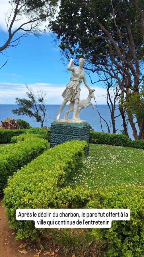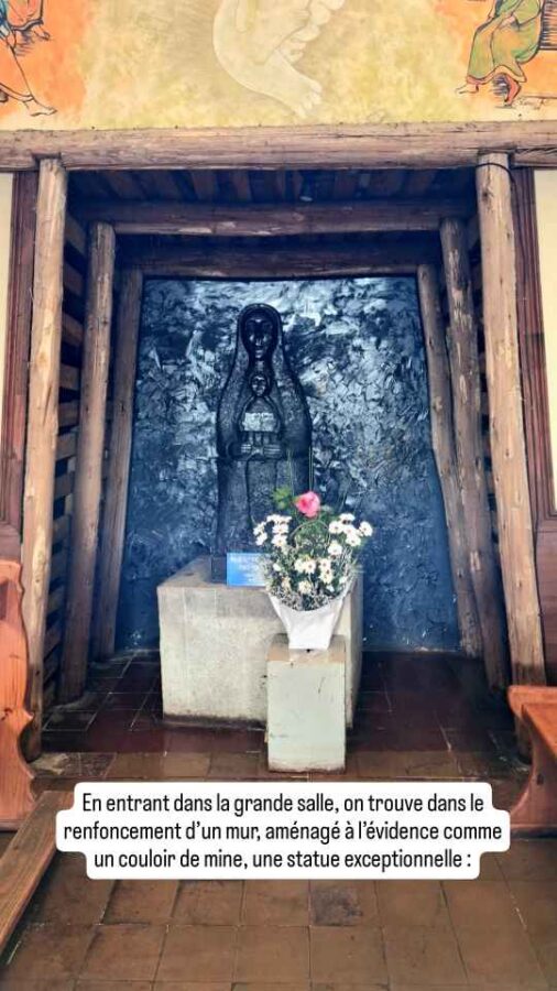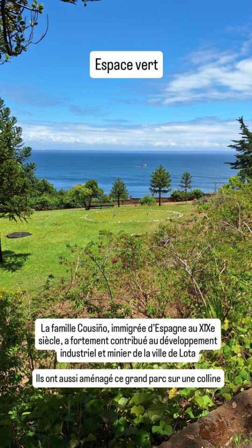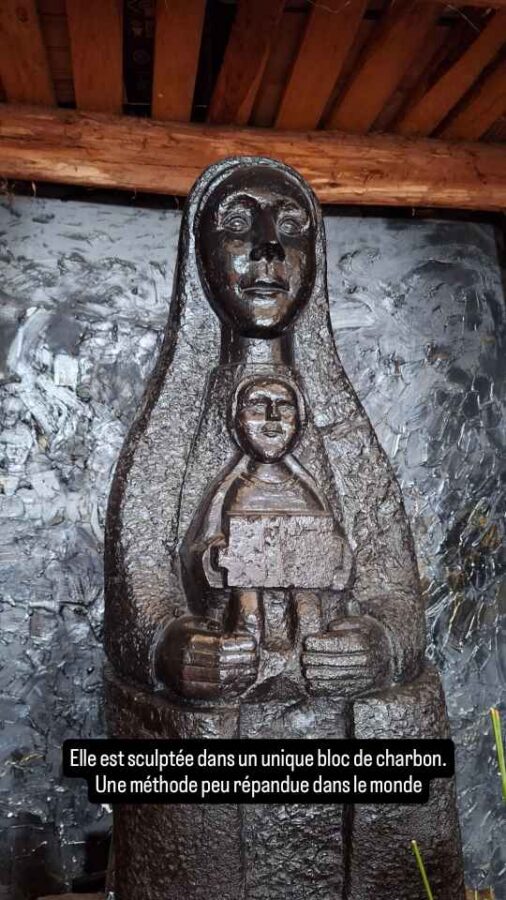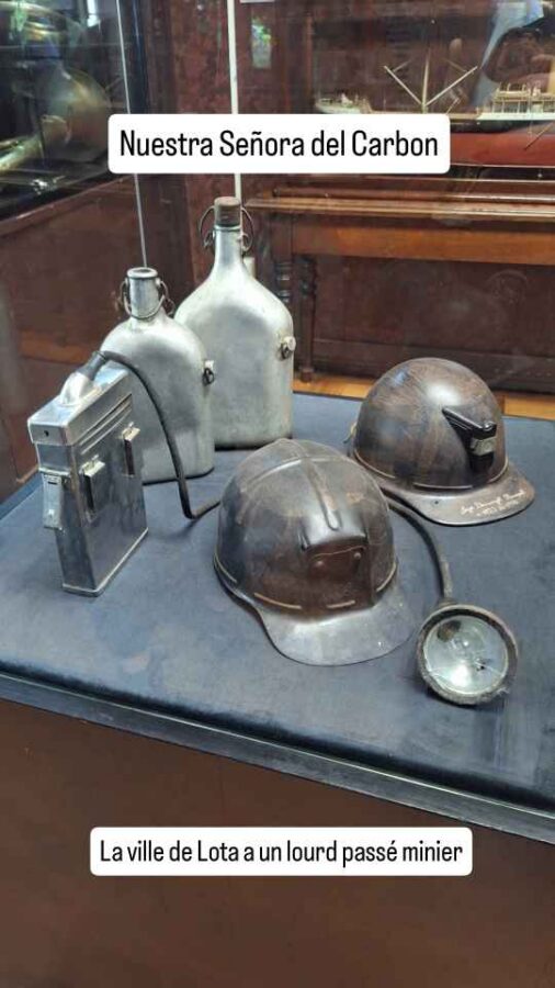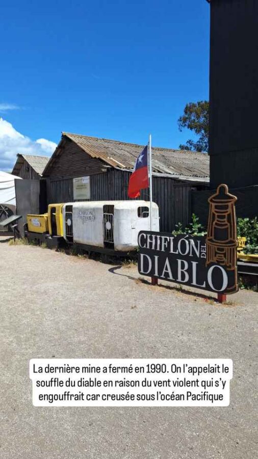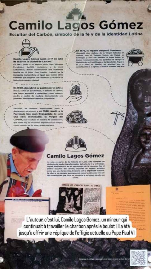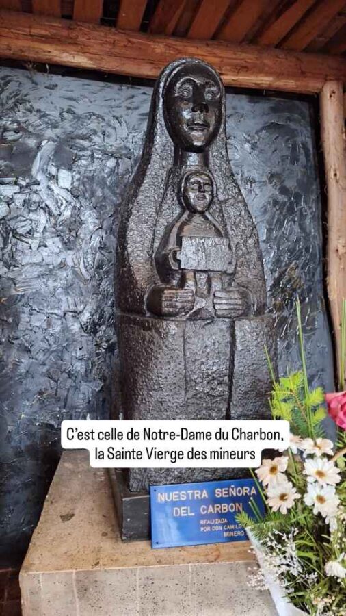 Un peu plus loin, nous gagnons Lota, une autre ville au passé minier encore plus marqué. La région produisait d’ailleurs la quasi-totalité du charbon du Chili. Toute cette production s’est éteinte en 1990 lorsque la dernière mine a fermé pour cause de politique verte gouvernementale. De 40% en 1990, la part du charbon dans la production de l’électricité est tombée à 15% en 2024 et devrait être nulle en 2030. L’objectif du pays étant de ne plus utiliser aucune énergie fossile en 2050. Dans l’attente, la ville a transformé les demeures des dirigeants des exploitations minières en musées, la mine la plus spectaculaire parce que creusée sous le Pacifique et bénéficiant d’une ventilation naturelle puissante (elle est appelée le Souffle du Diable) a été aménagée en attraction touristique et le grand espace vert aménagé avec goût par la riche famille dirigeante a été ouvert au public. Mais le lien avec le passé houiller qui a retenu le plus notre attention se cache dans une église paroissiale de la vieille ville : une étonnante vierge sculptée dans un bloc de charbon. La pratique aurait été courante dans les communautés minières, mais nous n’avions encore vu aucun exemplaire de ce type jusqu’ici. En tout cas cette sainte patronne des mineurs, appelée Nuestra Señora del Carbon (Notre-Dame du Charbon) est une œuvre singulière et magnifique.