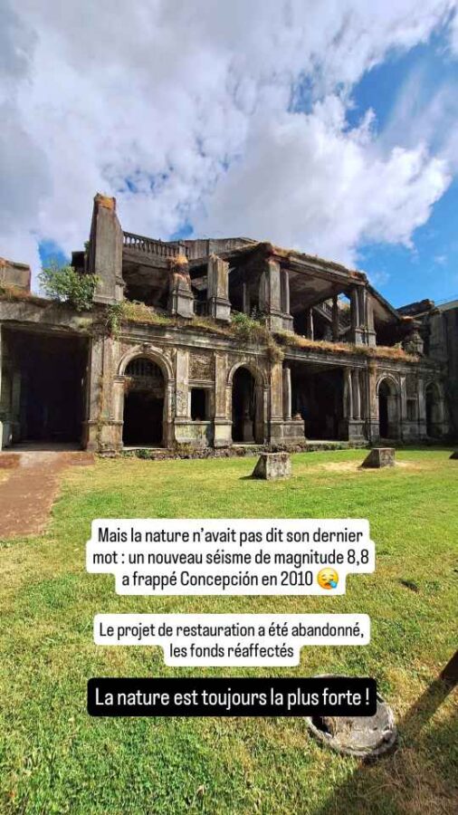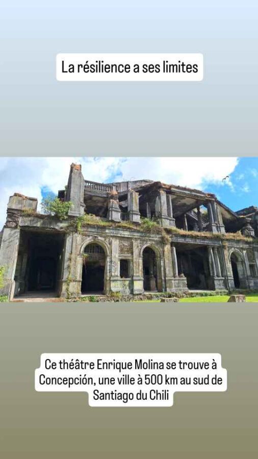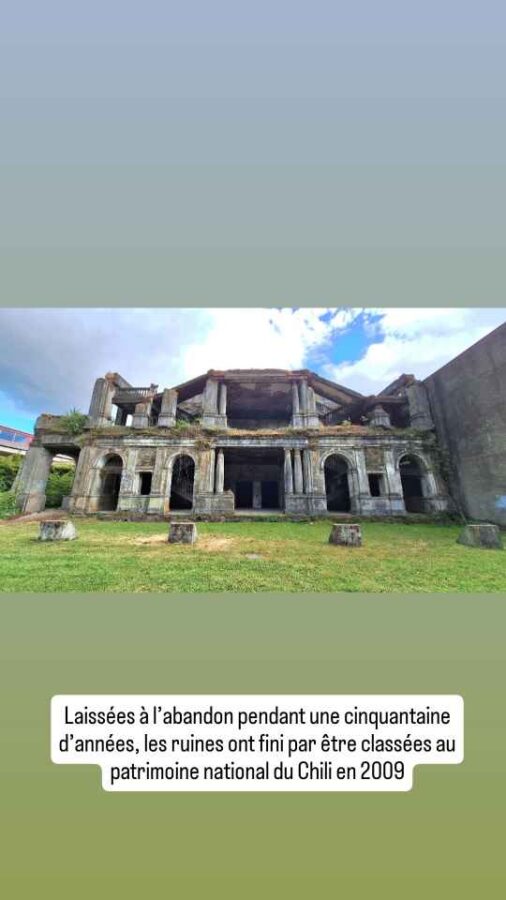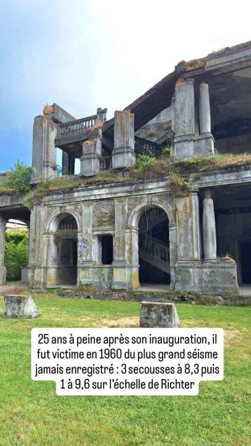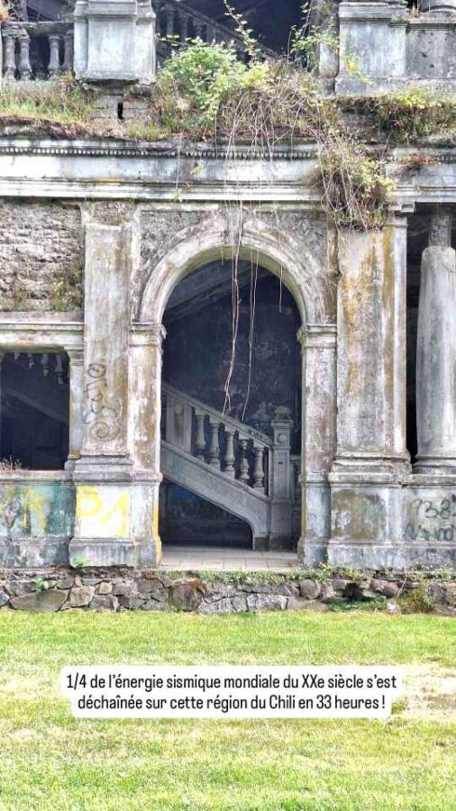 Nous sommes maintenant à Concepción, une grande ville toujours sur la côte Pacifique. Notre première découverte le long d’une avenue est un vieux théâtre en ruines dont l’accès est protégé par une grille. Ce théâtre Enrique Molina a une histoire bien mouvementée. A peine 25 ans après son inauguration, il fut très endommagé par le tremblement de terre de 1960, un évènement majeur au Chili. C’est d’ailleurs le plus grand séisme jamais enregistré : 9.6 sur l’échelle de Richter. Et cette secousse a été précédée à Concepción de 3 autres à une intensité de 8.3. Autant dire que la dernière a été le coup de grâce pour ce bâtiment comme pour beaucoup d’autres dans le centre du pays. Laissé à l’abandon pendant une cinquantaine d’années, le théâtre a fini par émouvoir les communautés artistiques et historiennes de la ville dont la mobilisation a permis en 2009 à la fois le classement du bâtiment au patrimoine national du Chili mais aussi le vote d’un budget pour sa restauration. Las, avant que les travaux aient pu débuter, un nouveau séisme majeur de magnitude 8.8 a touché la ville de Concepción en 2010. Le projet de restauration a été abandonné et les fonds ont été réaffectés. Dure dure la vie des théâtres chiliens !