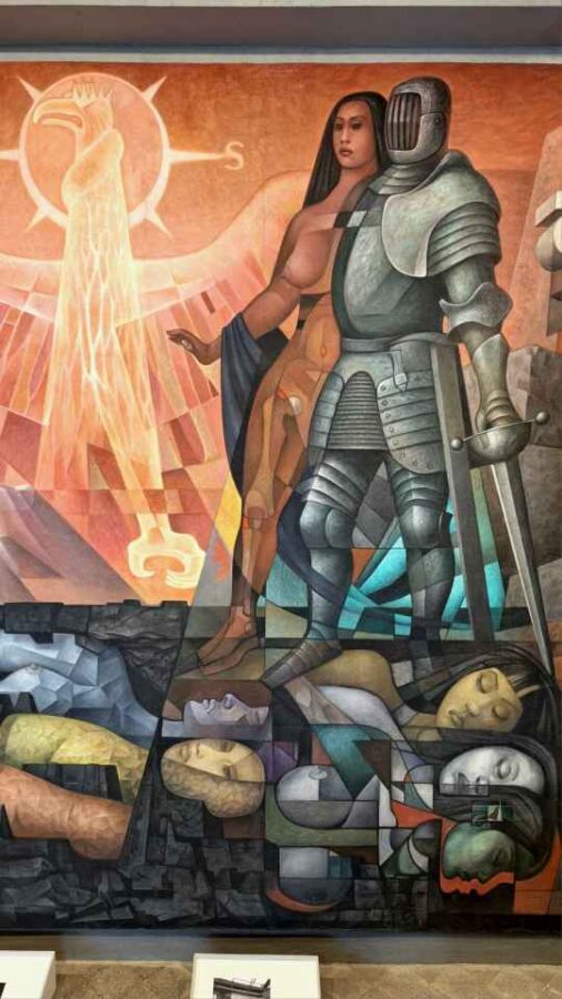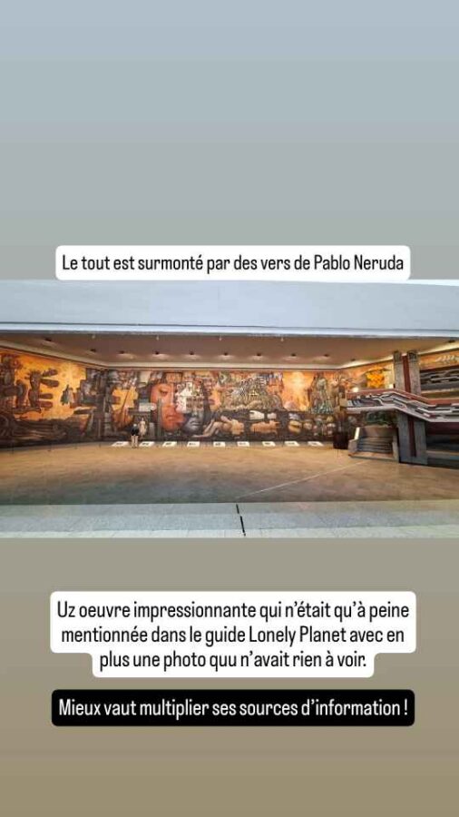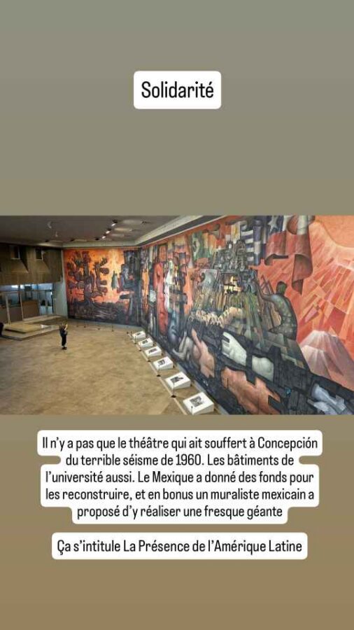 Le théâtre n’est évidemment pas le seul qui ait souffert de ce séisme où un quart de l’énergie sismique mondiale du XXe siècle s’est déchaînée sur cette région du Chili en l’espace de seulement 33 heures. L’université de la ville de Concepción a beaucoup souffert également. Son état de délabrement tout comme celui de nombreux établissements scolaires de la ville a déclenché un mouvement de solidarité international, naturellement plus marqué dans les pays de culture proche. C’est ainsi que le Mexique a pris en charge la reconstruction de nombreux bâtiments liés à la scolarité. Et dans la foulée, l’un de ses plus célèbres artistes muralistes de l’époque s’est proposé de réaliser une fresque géante dans l’entrée du bâtiment principal. C’est ainsi qu’est née La Présence de l’Amérique Latine, une œuvre de 250 m² basée sur l’histoire de toute l’Amérique latine, de la période précolombienne jusqu’à l’époque contemporaine de l’artiste, mettant l’accent sur la solidarité et la fusion des différentes cultures. Une œuvre impressionnante et belle qui nous aurait échappé si nous nous étions contentés de lire notre guide papier du moment, le Lonely Planet. Comme quoi il vaut mieux multiplier ses sources d’information.