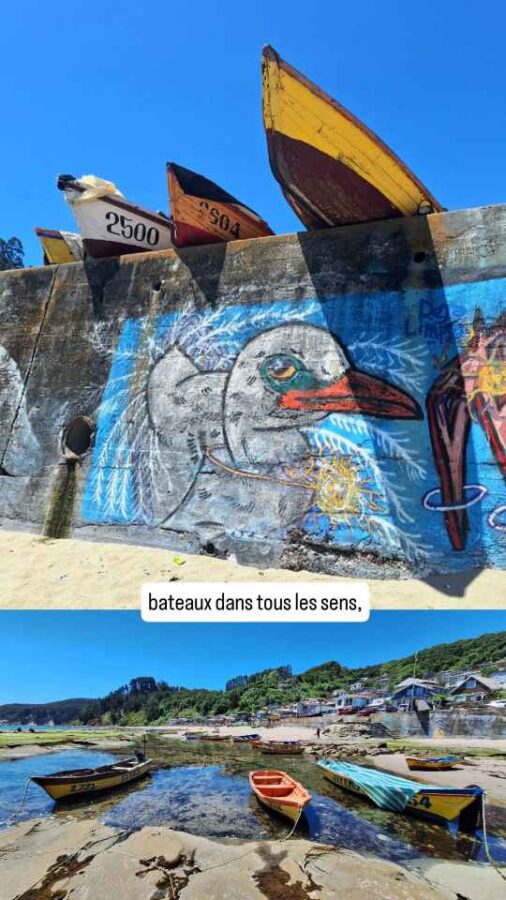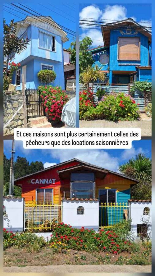 Colchogüe est un charmant village de pêcheurs, encore peu perverti par le tourisme. C’est un régal de se promener dans les ruelles bordées de maisons colorées et fleuries descendant vers la mer, de marcher sur le quai en enjambant les amarres et les filets des bateaux de pêche, d’observer les bancs d’algues et de coquillages laissés à découvert par la marée basse. Ce pourrait être n’importe quel village de pêcheurs en Bretagne, mais la multiplicité des couleurs, la rusticité de l’habitat et surtout la présence de stands d’empanadas et de mote con huesillo (voir la description dans le carrousel) sont assez typiques de la culture chilienne. Un beau moment d’authenticité et, à l’occasion, un joli parking fleuri pour Roberto.