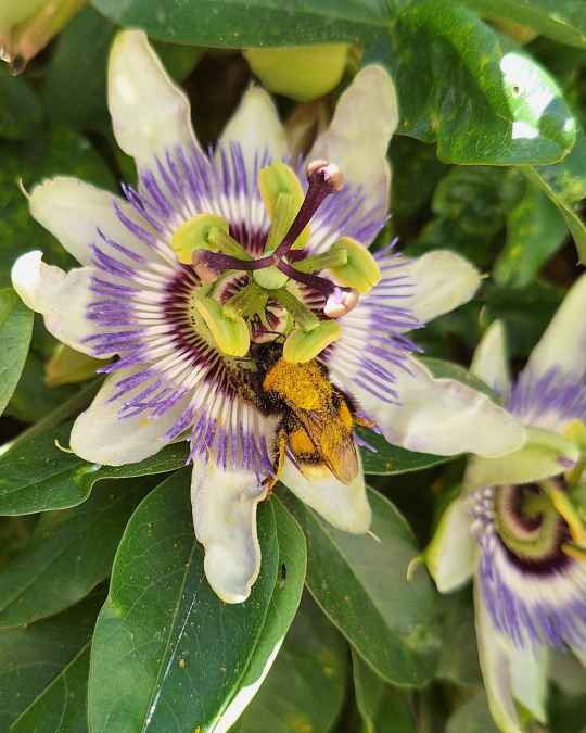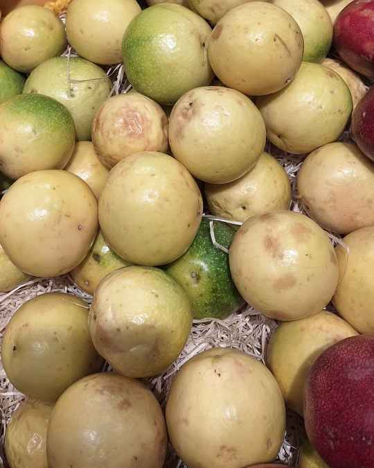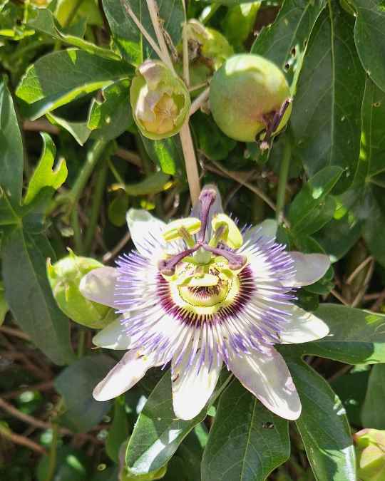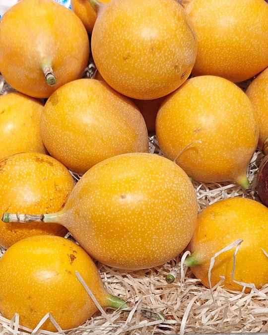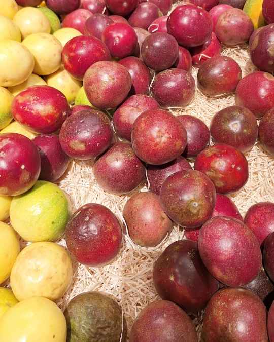 Mais certainement pas à la folie, disaient les missionnaires jésuites en montrant ces jolies fleurs aux amérindiens qu’ils tentaient de convertir à la religion chrétienne au XVIe siècle. « N’arrachez pas ces pétales, ce sont les apôtres ». Et la démonstration ne s’arrêtait pas là : la fleur comportait tant de caractéristiques évocatrices de la Passion du Christ (cette période qui couvre les évènements précédant ou accompagnant la mort de Jésus Christ) qu’ils l’appelèrent fleur de la passion. Devenue passiflore en termes botaniques. Si les 10 pétales représentaient selon eux les apôtres fidèles (sans Pierre ni Judas), les 72 filaments reproduisaient la couronne d’épines, les 5 étamines : les plaies de Jésus, les 3 stigmates : les clous, et le pistil le Saint Graal. Plus de 500 espèces de passiflores sont aujourd’hui décrites, et les fruits de ces fleurs de la passion s’appellent naturellement … les fruits de la passion. Beaucoup sont comestibles (et délicieux !) comme ceux des espèces Passiflora edulis edulis (petit fruits ronds à peau violette 📷 4), Passiflora edulis flavicarpa (un peu plus gros, ovoïdes et à peau jaune 📷 5), ou encore Passiflora quadrangularis (encore plus gros, à chair blanche et crémeuse, appelés grenadilles 📷 6). Mais les fruits encore verts ou ceux d’autres espèces peuvent contenir du cyanure, mieux vaut s’abstenir d’en consommer à moins d’avoir une passion … pour l’hôpital !