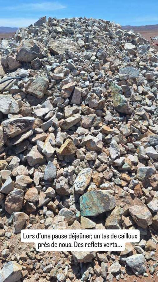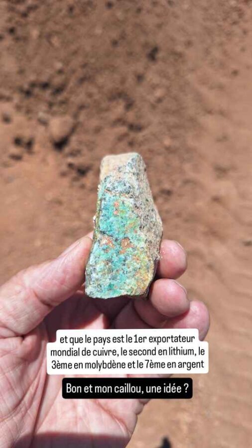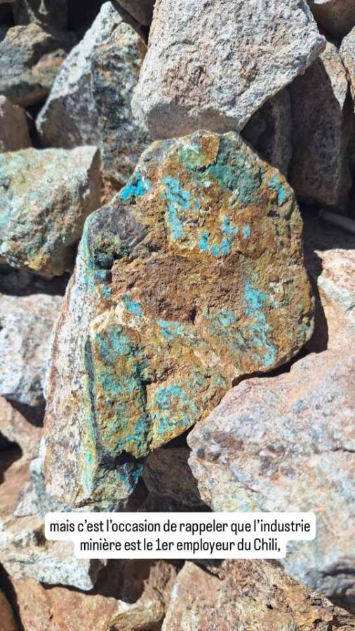 Au cours de notre progression dans le désert d’Atacama, nous croisons de nombreux chemins de traverses menant à des mines. Voire même lors d’une pause déjeuner au milieu de nulle part, nous trouvons dans des tas de cailloux de jolies pierres aux reflets verts. Difficiles à identifier, même avec Google Lens qui me propose au moins 10 minéraux différents. Le secteur minier est le secteur-phare de l’économie chilienne. Il est le premier employeur du pays (11% des emplois) et représente 60% de ses exportations, ce qui le rend sensible aux variations de cours et freine la diversification. Le Chili est le premier producteur mondial de cuivre, le second en lithium, le 3ème en molybdène et le 7ème en argent. La première entreprise minière mondiale est la société Codelco, détenue à 100% par l’état chilien et dont deux de ses engins géants sont exposés à l’entrée de la ville de Calama.