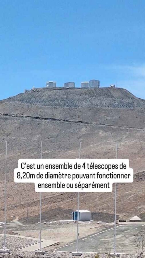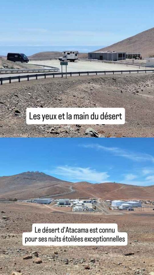 Le désert d’Atacama, c’est connu, est propice à l’observation du ciel, grâce à une altitude élevée (2500 à plus de 5000m), une pluviosité rare (moins de 100 mm par an) qui associée à une faible humidité de l’air donne un ciel dégagé plus de 300 nuits par an, et puis une faible pollution lumineuse. Normal, c’est le désert ! Conséquemment, 70% des observatoires du monde s’y sont installés, dont beaucoup sont plurinationaux. Nous avons fait un léger détour pour passer voir les installations du Very Large Telescope du Cerro Paranal, à 2635 m d’altitude. C’est en fait un ensemble de 4 télescopes de 8,20 m de diamètre qui peuvent fonctionner ensemble ou séparément, géré par l’Observatoire Européen Austral (ESO). Des visites sont organisées pour le public mais seulement de jour et le week-end, et il faut s’inscrire longtemps à l’avance. Un voisin est presque fini de construire à 20 km de là, très prometteur avec son miroir de 39 m de diamètre. Nous le verrons briller de loin, mais sans possibilité de s’approcher. Grâce à nos bivouacs en nature, nous nous contentons d’apprécier les magnifiques ciels étoilés de la région. Peut-être que nous pourrons participer à une expédition nocturne dans une prochaine étape, mais tout est souvent verrouillé pas mal de temps à l’avance et nous n’avons pas envie de casser notre liberté avec des rendez-vous précis.