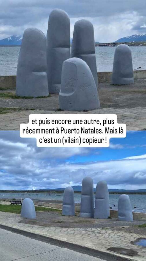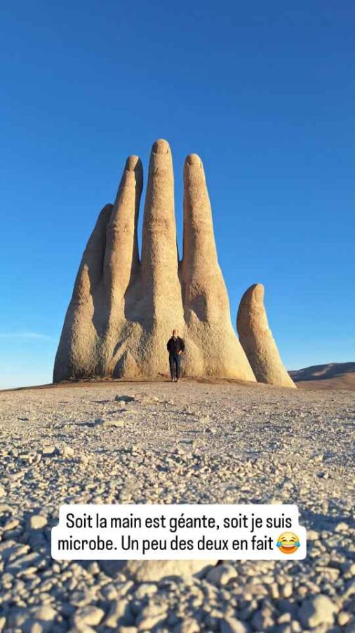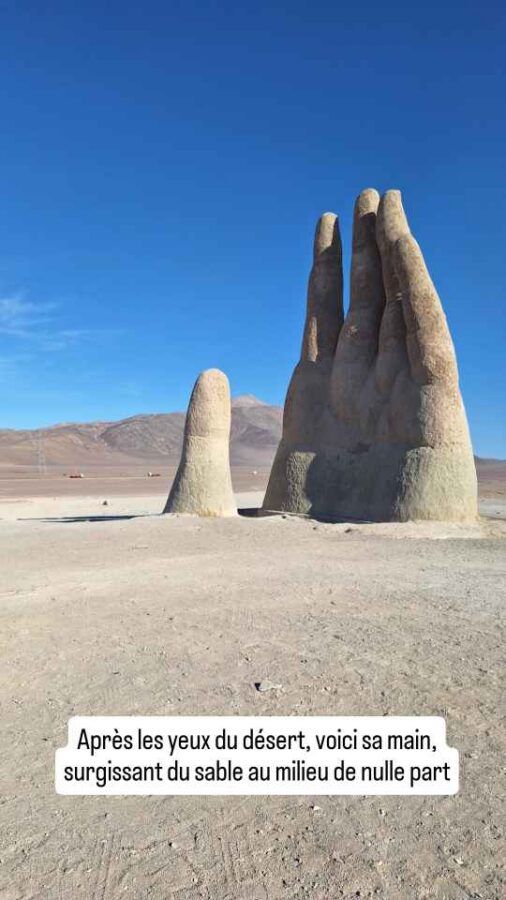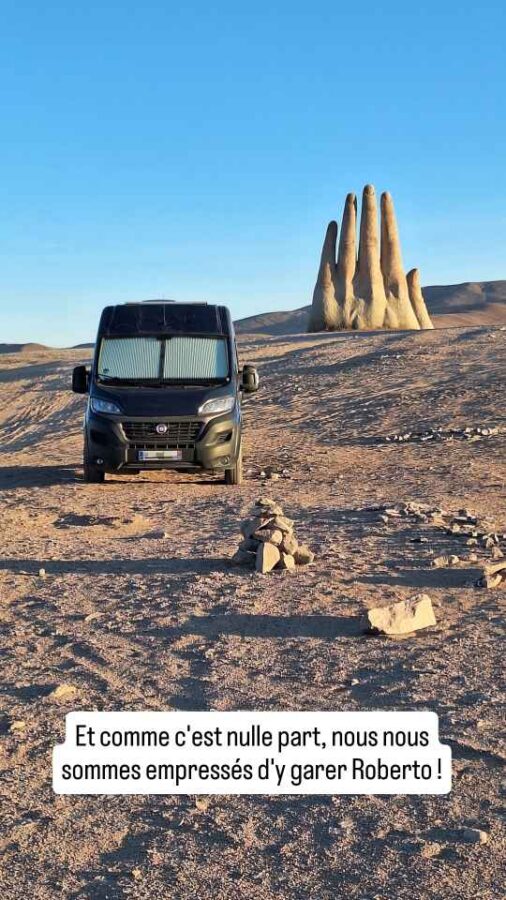 Après 400 km de route ce jour-là, nous sommes toujours dans le désert. Et nous décidons de nous laisser prendre par la main pour y passer la nuit. La main du désert, c’est une sculpture au milieu de nulle part, une main géante qui semble sortir du sable pour nous faire un signe désespéré. Ce serait d’ailleurs la signification voulue par l’auteur, montrer la vulnérabilité et l’impuissance humaine. Malgré l’isolement, le lieu est assez visité car visible de l’autoroute à 450 m de là. Nous ne serons d’ailleurs pas les seuls à y passer la nuit, entre un groupe de motards venus planter leur tente assez loin et un poids-lourd venu se reposer tout près. Cette main surgissant du sable nous en a rappelé une autre, vue sur une plage d’Uruguay il y a de cela 7 ou 8 mois, et ça n’est pas une coïncidence : elle est du même artiste chilien, Mario Irarrazabal. Et puis encore une autre, plus récemment à Puerto Natales au sud du Chili. Mais là c’est une tentative de copie.