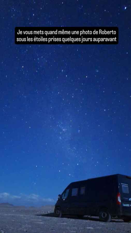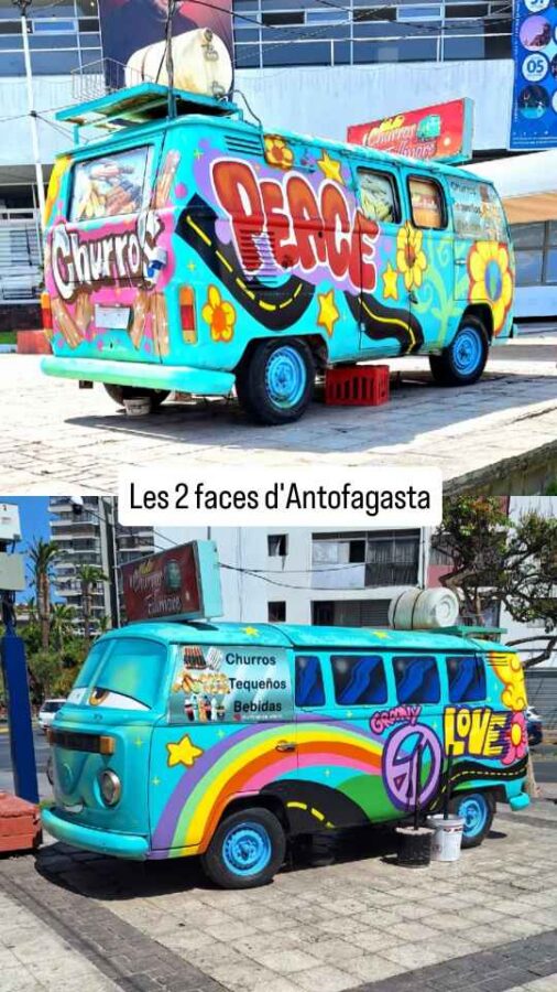 Le lendemain, nous réfléchissons à la suite potentielle des visites, mais, à lire les commentaires des autres voyageurs sur notre application, rien ne nous tente. Les geysers d’El Tatio ne se réveillent qu’entre 6 et 7 heures du matin, il faut dormir à plus de 4000 m d’altitude et faire la queue le matin derrière une longue colonne de minibus. Comment cela peut-il être mieux que le merveilleux site de Yellowstone, accessible le jour entier et avec des températures clémentes ? Différents bassins d’eau thermale ou très salée nous tentaient, mais les commentaires font état de températures plutôt basses, genre 11°C le matin. Brrr ! Quand aux montagnes colorées finalement sans couleurs et au « bus magique » qui attire les foules alors que ce n’est qu’une épave taguée de bus rouillé en plein désert, bof. Nous aurions bien participé à une sortie nocturne pour voir les étoiles, mais le ciel habituellement clair s’est mis à se couvrir la nuit pendant notre séjour. Alors nous décidons de quitter la ville et de reprendre notre route vers le nord. Mais cela ne va pas se passer comme prévu…