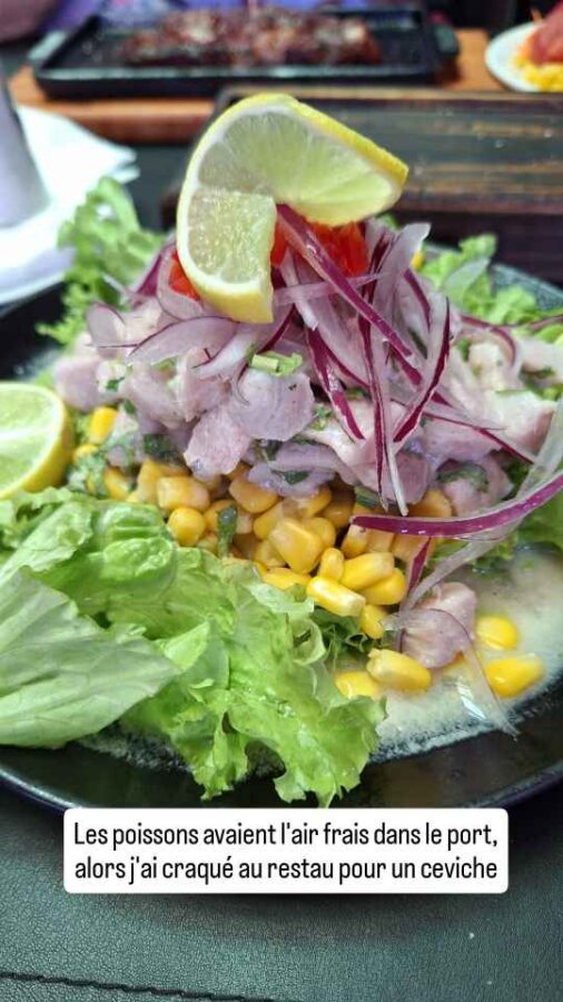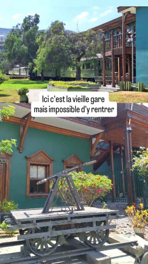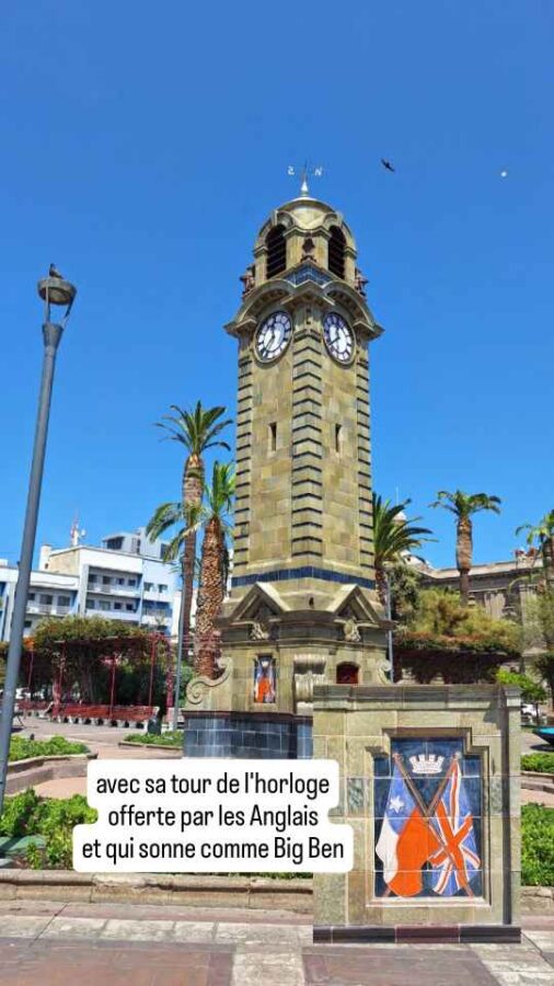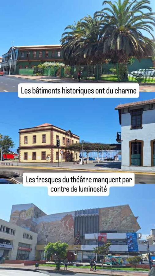 L’arrivée dans cette grande ville minière de la côte Pacifique n’est pas des plus réjouissantes : montagnes de résidus de minerais, alignements de camions-bennes à n’en plus finir et larges bas-côtés couverts de baraques de tôle, de pneus et de poussière donnent envie de vite poursuivre la route vers une autre destination. Mais il faut savoir gagner le centre historique et le port. La vieille gare, les bâtiments de style colonial, la place centrale avec sa tour de l’horloge qui carillonne sur les mêmes notes que Big Ben toutes les heures (normal, elle a été offerte par les Anglais) et la jetée en bois avec ses lions de mer ont un charme certain, même si le trafic routier est un peu trop envahissant. Nous déjeunerons au restaurant pour la première fois depuis notre retour, d’une bonne viande chilienne pour Claudie et d’un excellent ceviche pour moi. Le seul malheureux était Roberto, garé très en pente à l’entrée d’un parking couvert dont la limite de hauteur à 2,15m n’était pas signalée. C’était la seule place possible, mais il n’aurait pas fallu le pousser beaucoup pour qu’il se renverse !