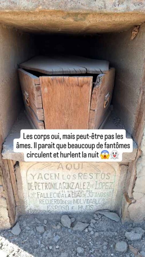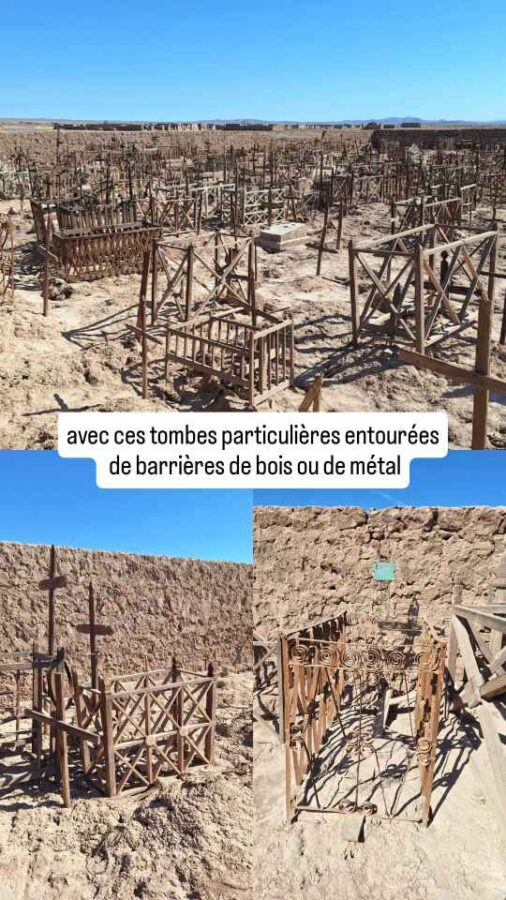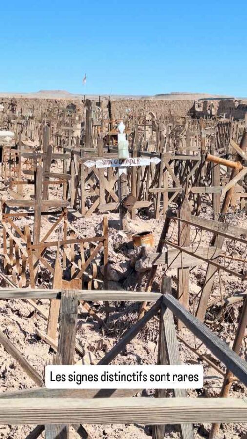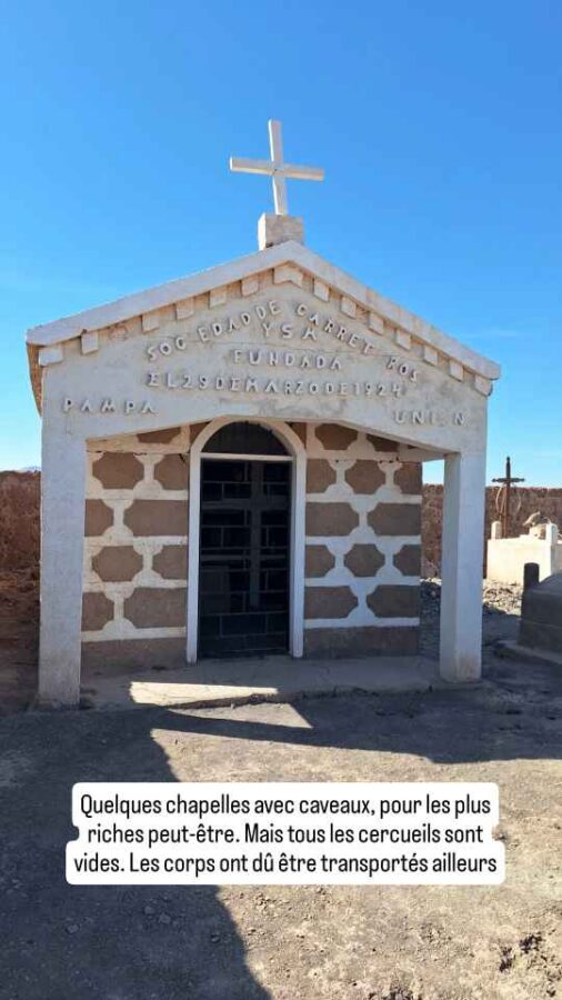 Au XIXe siècle, l’extraction du salpêtre battait son plein au Chili dans le désert d’Atacama, et de nombreux villages poussaient comme des champignons pour héberger tous ceux qui venaient profiter de ce que l’on pourrait appeler la fièvre du nitrate ou encore la ruée vers l’or blanc. Au début du XXe siècle, on trouva le moyen de synthétiser le salpêtre, ce qui fit péricliter toute cette activité. Ce ne fut pas forcément une mauvaise chose pour les mineurs qui perdaient leur santé dans ce travail harassant, mais forcément, ce la les obligea à quitter les lieux. C’est ainsi que l’on trouve dans la région de nombreux villages fantômes. Nous nous sommes arrêtés pour jeter un œil à celui appelé Pampa Union. Il ne reste guère que les murs des bâtiments, dont la faible résistance au temps semble montrer qu’ils ont été construits à la hâte. Le mieux conservé, si l’on peut dire, c’est le cimetière, empli de petites tombes en terre entourées d’une grille de bois ou de métal. Le long d’un mur, des caveaux contiennent encore des cercueils dont le contenu a manifestement été transposé ailleurs. Mais les âmes sont peut-être restées, de nombreuses histoires circulent sur des fantômes se promenant et hurlant la nuit dans ces villages…