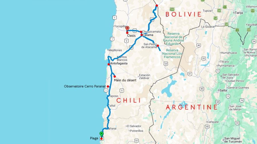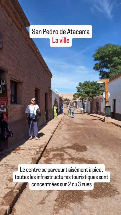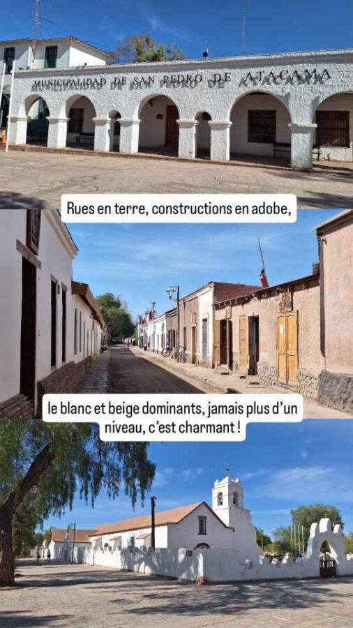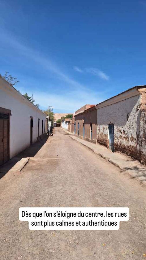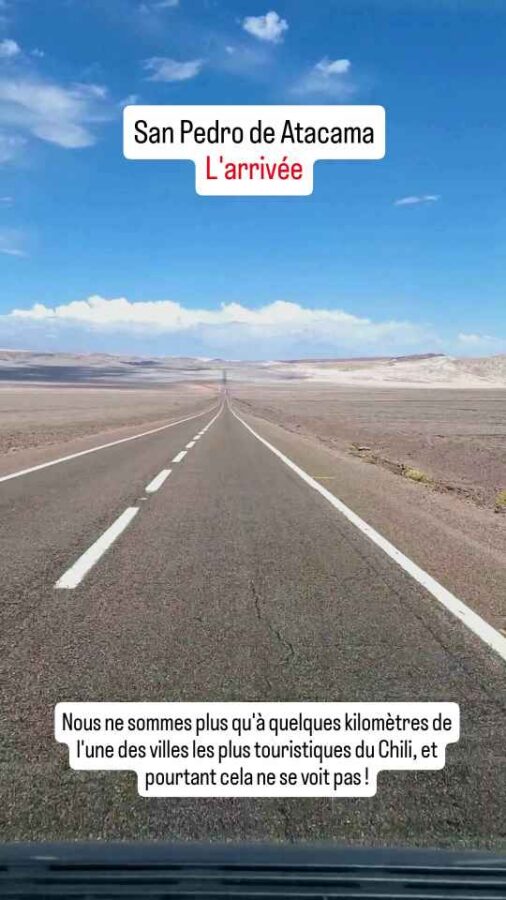Nous n’en sommes qu’au début du désert d’Atacama qui n’est pas loin de couvrir le quart du nord du Chili avec plus de 1000 km de longueur. 105 000 km² de sable et de roches, 4 000 km² de lacs salés asséchés. On trouve tout de même ça et là quelques oasis, dont celle de l’une des villes les plus touristiques du Chili : San Pedro de Atacama.