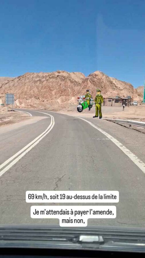 Nous quittons San Pedro de Atacama par la route principale. Très vite, les maisons disparaissent et nous nous retrouvons dans le désert. Nous sommes toujours pourtant dans les limites administratives de la ville (qui ne sont indiquées par aucun panneau) avec une vitesse limitée à 50km/h. Malheureusement, un policier de brigade mobile me flashe à 69 km/h. Je ne conteste pas, il remplit les papiers et je m’attends à ce qu’il m’indique le montant de l’amende. Mais à la place, il conserve mon permis de conduire et me tend un papier qu’il faudra présenter au Tribunal de Police 4 jours plus tard afin de récupérer mon précieux document. En échange sans doute du paiement de l’amende. Le terme de Tribunal de Police fait un peu peur, mais il s’agit probablement d’un simple guichet administratif. Manifestement, il s’agit à la fois d’un système anticorruption en interdisant aux policiers de percevoir de l’argent et d’une garantie de paiement pour le gouvernement en obligeant à se présenter pour récupérer son permis, à l’instar des policiers mexicains qui dévissaient les plaques d’immatriculation des véhicules qu’ils verbalisaient. Il ne s’agit pas d’une suspension de permis, puisque je suis autorisé à circuler avec le papier qu’ls m’ont donné, mais c’est tout de même pénalisant.