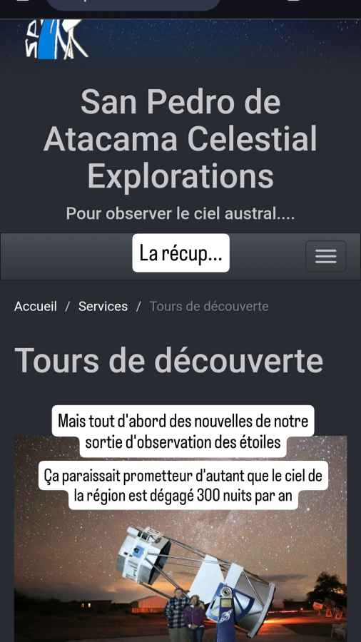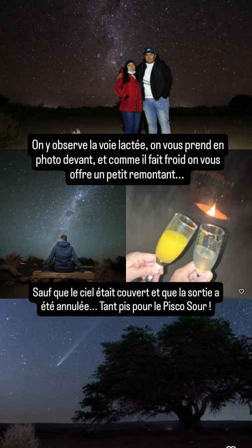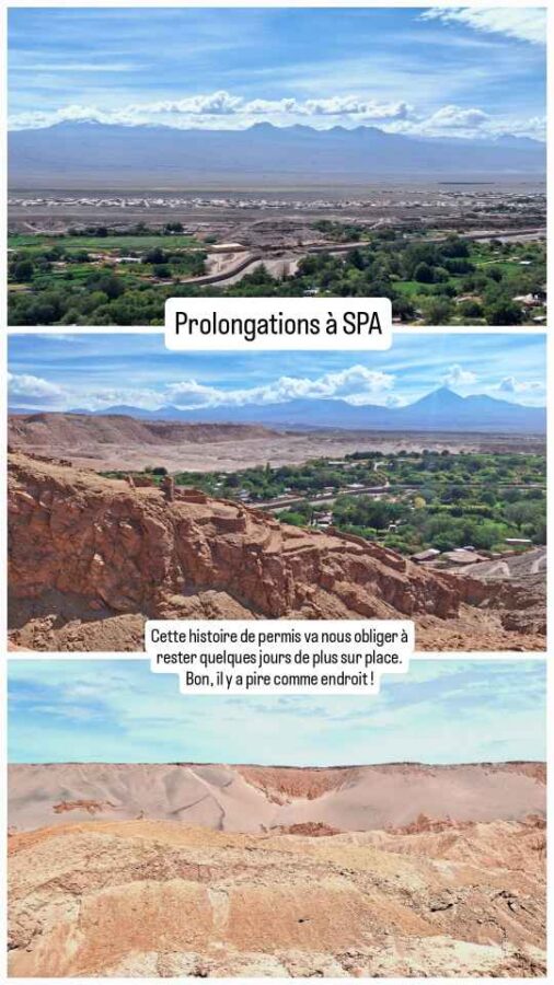 Arrivés à San Pedro, nous nous installons sur un petit parking à proximité du Tribunal de Police. Je m’y rends à l’ouverture à 14h30 (c’est un lundi). Alors que je m’attendais à une longue attente – un a priori sur la bureaucratie chilienne ? – je suis pris presque tout de suite. Je tends les papiers au guichet. On m’annonce le montant de l’amende avec d’après ce que je comprends un « discount » mais que le seul moyen de paiement du jour est un transfert bancaire. Autant dire la galère à partir d’un compte français. Mais on me dit aussi que le lendemain matin, tous les moyens de paiement seront disponibles… Qu’à cela ne tienne, Roberto est autorisé jusqu’en avril, je peux revenir demain ! De toutes façons, nous avons rendez-vous dans l’après-midi avec une famille française (un couple et 2 garçons de 5 et 8 ans) qui traverse en 2 ans l’Amérique du Nord au Sud dans un camion aménagé. Nous les suivions depuis un moment sur les réseaux et attendions le moment de les rencontrer à l’endroit où nous allions nous croiser puisque nous allions en sens inverse. Et ça c’est trouvé justement ici, à San Pedro de Atacama. Nous échangeons un bon moment sur nos aventures respectives et plus largement nos vies. La passion des voyages en famille cumulée avec la vie nomade est toujours agréable à partager entre initiés. Nous les quittons en fin de journée après l’apéro. Chacun de nous a réservé une soirée d’observation des étoiles avec une agence différente. Mais le ciel semble bien couvert ce soir. Parfois ça se dégage, parfois pas, nous verrons bien.
