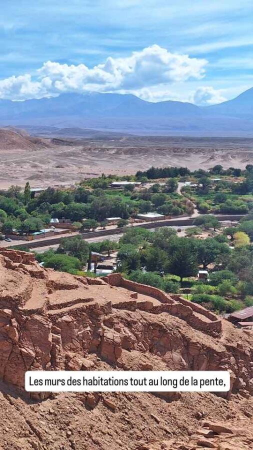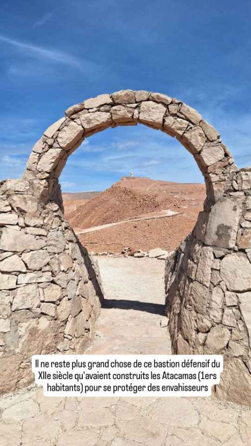 Cette immobilisation nous force à changer nos plans. Nous avions prévu de partir vers le nord du Chili et de quitter le pays avant l’expiration de l’autorisation de circuler de Roberto (ATV) 6 jours plus tard. Mais là, avec les 4 jours pour récupérer le permis, ça sera trop juste. Soit il nous faut demander une prolongation de l’ATV en cours, soit faire un aller-retour en Bolivie pour obtenir une ATV toute neuve. Nous avions déjà demandé pour la prolongation : celle-ci ne peut se faire qu’au bureau de douane qui nous a délivré le papier, celui de Patagonie. Mais il n’est pas obligatoire de retourner là-bas (heureusement !) cela peut se faire par courriel. Sauf qu’ils n’ont jamais répondu à aucune de nos 2 demandes. Il nous reste donc la solution de l’aller-retour en Bolivie. Le problème est que la frontière la plus proche, à 35 km de là, mais à 4500 m d’altitude, est fermée pour plusieurs jours en raison d’une tempête de neige annoncée. L’alternative est d’aller à celle d’Ollaguë, à 300 km de là, dans un secteur que nous n’avions pas prévu de visiter. Nous prenons la journée pour y réfléchir et nous remettre de nos émotions. Nous allons visiter le matin la forteresse de Quitor, datant du XIIe siècle, à l’époque où les Atacamas (premiers habitants) devaient se protéger des agressions extérieures avant d’être finalement envahis par les Incas au XVe siècle. C’est à l’état de ruines, mais le panorama vaut largement les efforts.