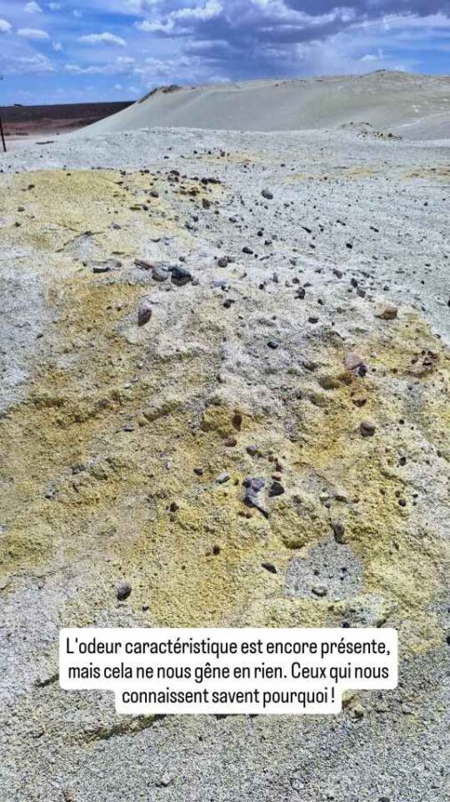 L’après-midi, nous allons nous installer près d’une ancienne mine de soufre. Du jaune partout et une odeur familière certes, mais beaucoup d’immondices autour de nous et bientôt du vent fort, de la pluie et des éclairs : la tempête annoncée arrive ! Nous nous déplaçons de dessous notre arbre en attendant l’accalmie.