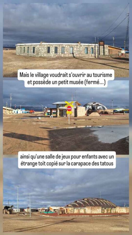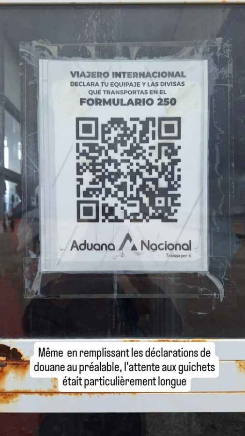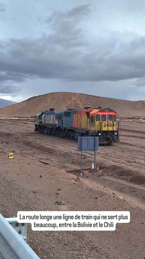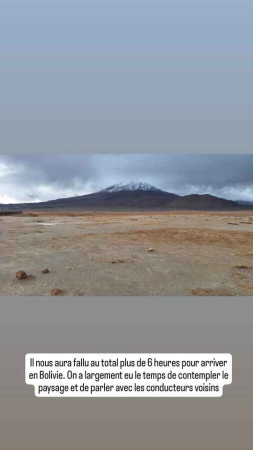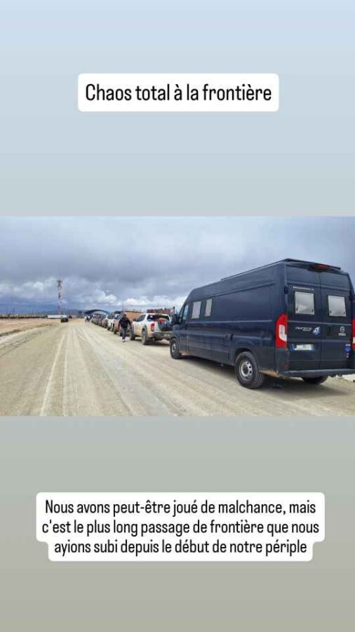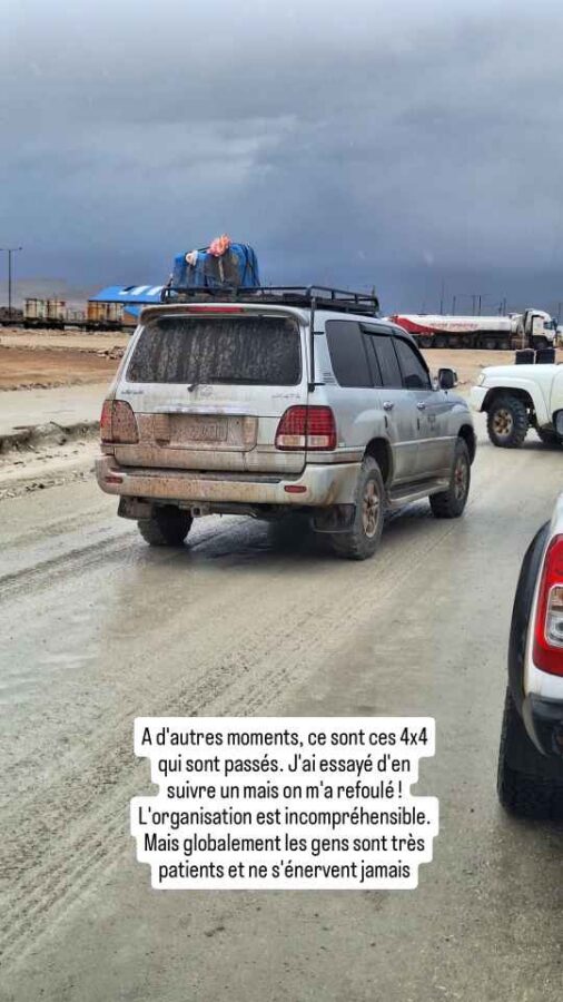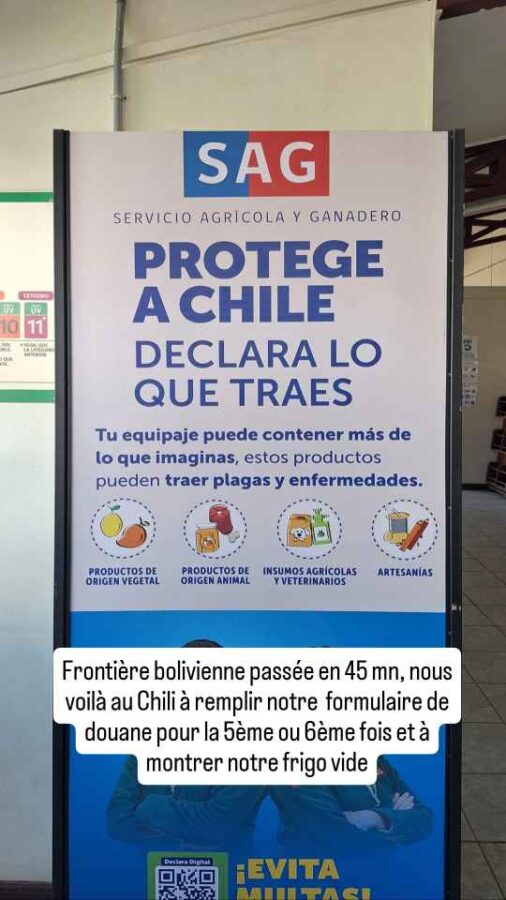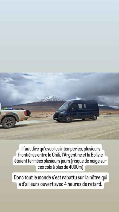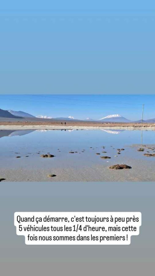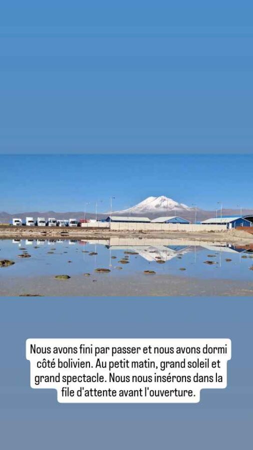 A 8h30 tapantes, nous nous présentons à la douane, nous étonnant au passage d’être seuls. Le douanier nous annonce que, en raison des conditions météorologiques, le côté bolivien n’ouvrira qu’à midi, et qu’eux vont en faire de même. Nous retournons en ville pour attendre et faire quelques photos, le soleil étant revenu. Cela dit, nous apprenons sur les réseaux que des torrents de boue ont traversé San Pedro de Atacama, que de nombreuses maisons ont été inondées. Nous avons bien fait de nous en échapper ! Nous déjeunons de bonne heure pour nous présenter à midi précis à la frontière. Mais l’ambiance n’est plus la même que ce matin : une file d’une soixantaine, peut-être d’une centaine de véhicules fait déjà la queue sur la route. Nous nous en voulons d’être restés tranquillement en ville alors que tout ce petit monde arrivait peu à peu dans la matinée. Nous aurions mieux fait de rester stationnés à la douane ! Bon, c’est fait, nous remontons l’immense file de camions jusqu’au dernier. Tout en apercevant au passage, à mi-distance, des minibus en double file à côté des camions. Nous faisons alors demi-tour, doublons la moitié des camions et allons nous installer derrière un pick-up arrivé entre temps. Une longue attente va commencer. Déjà nous n’allons pas bouger avant deux ou trois heures. La frontière est opérationnelle, mais pour les piétons seulement, et essentiellement ceux descendant des bus venant de Bolivie. De temps en temps, les poids-lourds à notre droite avancent aussi, par groupes de quatre ou cinq. Et puis c’est enfin notre tour. En fait c’est ce que nous croyions : seuls des gros 4×4 conduits par un seul chauffeur passent. Au bout de 3 heures, c’est enfin le tour des véhicules particuliers. Nous sommes envoyés 5 par 5 sous l’auvent de la douane. Autant dire que ça avance plutôt lentement. Là, nous nous retrouvons dans une queue impressionnante, mal organisée, avec 3 pauvres guichets pour tout ce monde. On nous fait changer de file plusieurs fois, c’est incompréhensible. Nous finissons tout de même par en sortir, avec le coup de tampon qu’il faut sur nos passeports, et allons déposer l’ATV de Roberto au bureau de la circulation. Nous quittons enfin le Chili. La douane Bolivienne est à 5 km de là, mais sera tout autant chaotique et désordonnée. Si la validation de nos passeports est plutôt rapide, l’établissement du permis de circuler pour Roberto va prendre 20 mn. Tout ça pour l’annuler le lendemain matin ! Nous entrons en Bolivie épuisés, après 6 heures de démarches au total pour franchir cette frontière qui avait plutôt réputation de simplicité. Peut-être ont-ils été débordés par une affluence inhabituelle liée aux intempéries, les deux autres points de passage étant fermés ? Le retour le lendemain va-t-il se faire dans les mêmes conditions ?