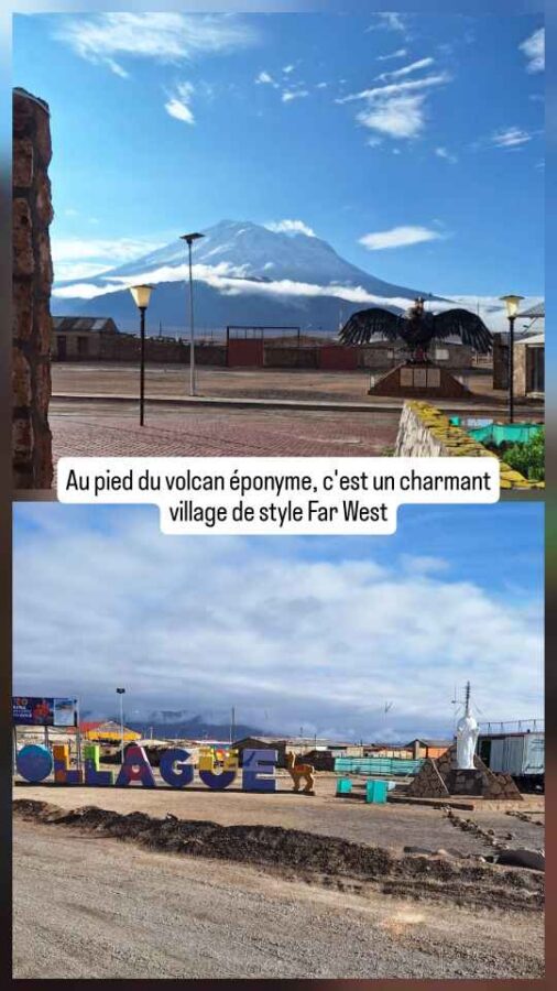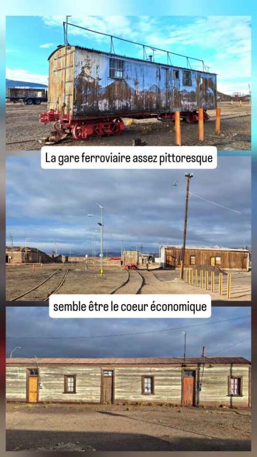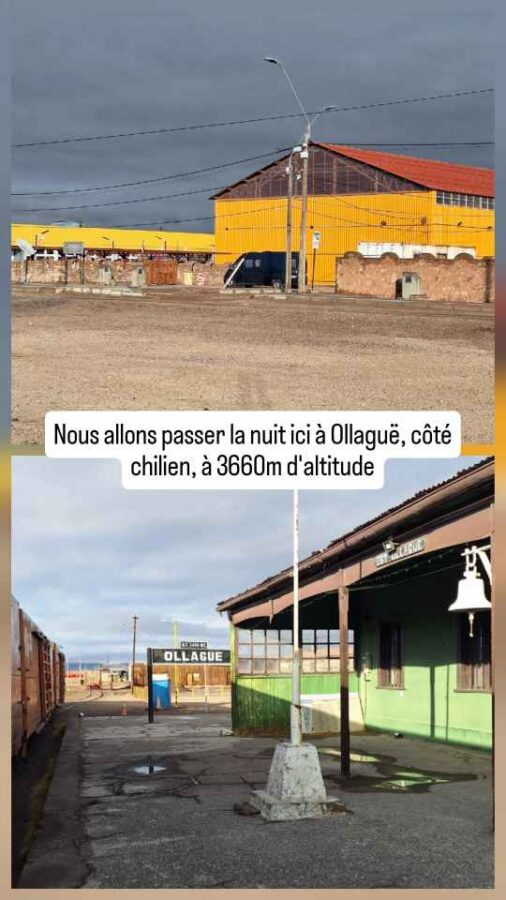 Nous partons vers le Nord-Est, nous rapprochant peu à peu de la frontière avec la Bolivie. La route ne cesse de monter mais s’avère spectaculaire : à droite une chaîne de volcans enneigés qui disparaissent peu à peu sous les nuages qui s’accumulent en noircissant peu à peu. A gauche, des plateaux arides dont la végétation rousse s’assortit à la couleur de la roche qui l’accueille. La circulation est très peu dense. Nous allons droit vers le mauvais temps, et une forte pluie s’abat bientôt sur nous. Générant aussi de grosses flaques sur la route assez irrégulière, qui nous font soulever de belles gerbes d’eau argilo-boueuse. Je ne vous dis pas l’état de Roberto à l’arrivée ! Nous parvenons en fin d’après-midi à Ollaguë, 3 660 m d’altitude, le poste frontière côté chilien. Une ville minière de style très far-west avec sa gare envahissante, ses maisons de bois, ses commerces quasi-inexistants. Mais du charme malgré tout. Nous décidons d’y passer la nuit et de franchir la frontière le lendemain matin. Il est prévu qu’elle ouvre à 8h30.