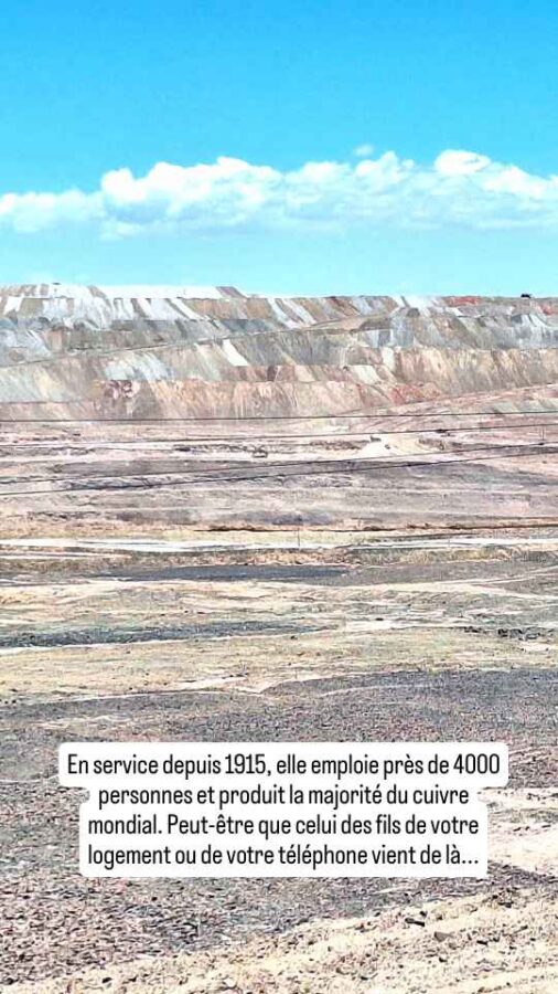 C’est reparti pour le plaisir de prendre son temps sur la route. Cela dit, à cause de nombreux travaux et des circulations alternées d’une longueur impensable en Europe (parfois plus d’une heure voire une demi-journée entre chaque sens de circulation), nous ne ferons que la moitié du parcours prévu. Un premier arrêt est pour la mine de Chuquicamata, inratable dans le paysage. Fierté du Chili, et pilier de son économie, elle a été la plus grande mine de cuivre à ciel ouvert du monde, phagocytant tout lors de son expansion sur plus de 5 kilomètres de longueur et 3 de largeur, même la ville qui l’a vue naître. La montagne des résidus de traitement du minerai qui en résulte est aussi gigantesque que multicolore. Contrairement à l’univers, elle n’est plus en expansion, l’exploitation se poursuivant désormais en souterrain pour cesser de polluer le voisinage, dont la toute proche ville de Calama, 165 000 habitants. Tout en consommant beaucoup d’eau dans l’une des régions les plus arides du monde. Paradoxalement, le cuivre produit participe à la transition écologique, où l’utilisation des éoliennes, de l’énergie solaire et des voitures électriques nécessite beaucoup plus de cuivre que lors de l’utilisation des énergies fossiles ou des véhicules thermiques…