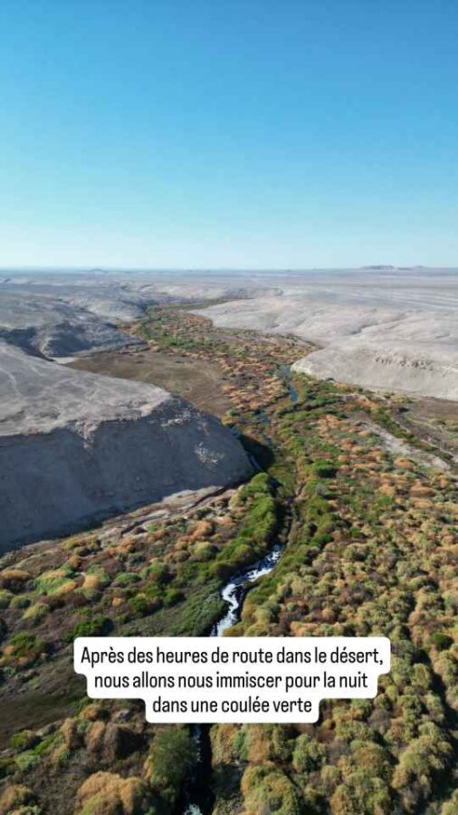 Après avoir parcouru plus d’une centaine de kilomètres sans voir la moindre végétation, nous jetons notre dévolu pour la nuit sur la coulée verte de l’une des très rares rivières qui traversent le désert d’Atacama : le rio Loa. L’eau est foncée, peu incitative à la baignade, mais le paysage et la fraîcheur qui en résultent rendent l’endroit apaisant et propice à un repos réparateur. Comme d’habitude, nous serons seuls sur le lieu.