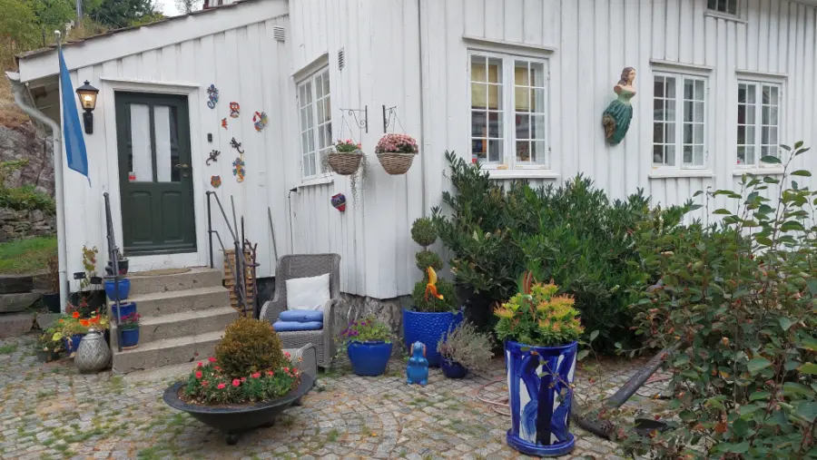 Les norvégiens aiment bien placer tout un tas de bricoles derrière leurs fenêtres, que celles-ci donnent sur la rue ou non. Ils aiment tout autant installer dans leur jardin des statuettes en tout genre, de vieux vélos munis d’un pot de fleurs sur le porte-bagages. Ils aiment aussi décorer leurs boîtes aux lettres et, très nationalistes, orner leurs maisons d’un drapeau. Au moins quand on passe on est sûr de ne pas s’être trompé de pays !