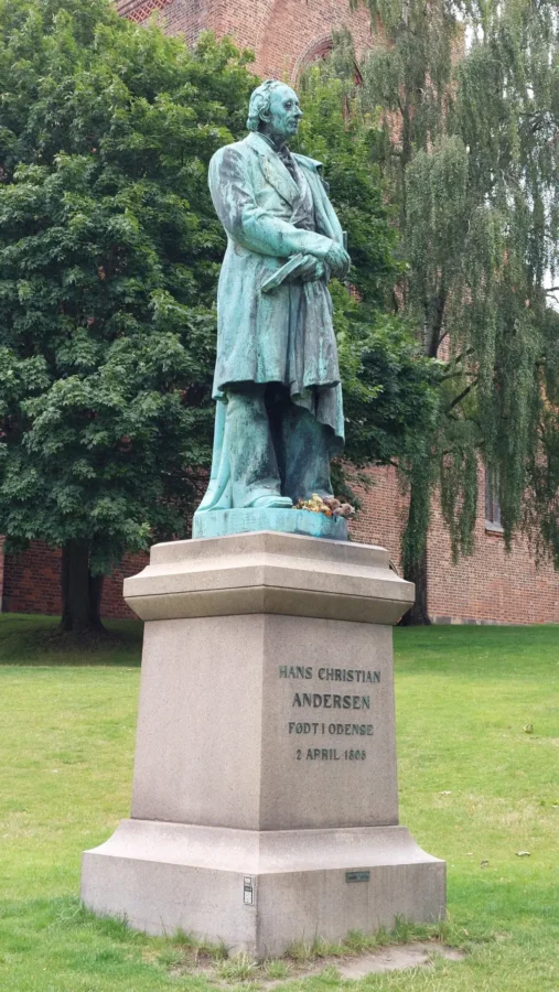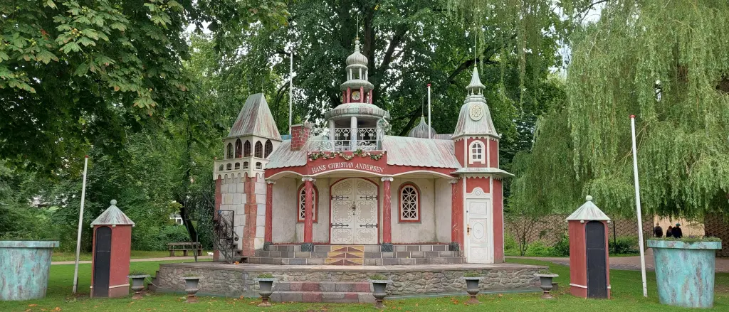 A Odense, sa patrie natale, nous ne pouvions manquer de rendre visite à Hans Christian Andersen. Nous avons tenté notre chance à sa première demeure, mais il n’y était plus depuis longtemps. Sa seconde était fermée depuis le début de l’été, pour être remplacée par une autre, un musée flambant neuf exposant apparemment de long en large tout ce qui concerne le célèbre conteur danois, mais le musée était fermé, précisément aujourd’hui en raison d’un problème électrique. Vraiment pas de chance. Après une courte visite dans la ville, nous sommes allés voir le Jardin d’Andersen. Il n’y était pas non plus, mais nous avons quand même vu sa statue. Nous avions rendez-vous avec une petite troupe de conteurs amateurs qui selon nos guides et Internet se produisaient devant la Maison des Contes de Fées, au centre de ce jardin, tous les jours jusqu’à mi-août à 11h et 13h. Eh bien ils n’étaient pas là non plus, la mi-août ne doit pas tomber en même temps au Danemark qu’en France ! Visite complètement ratée, quoi. En l’absence d’Andersen, je me permets de vous conter, en empruntant sa manière, une petite mésaventure qui vient de nous arriver.
