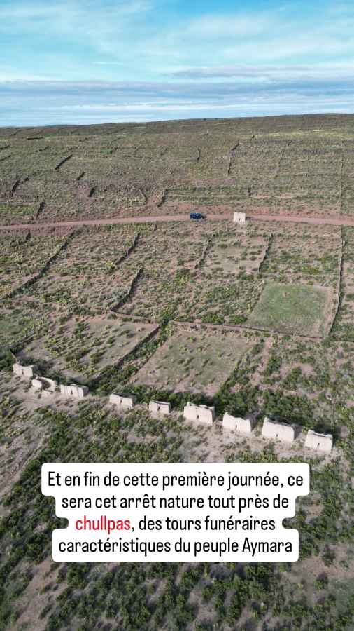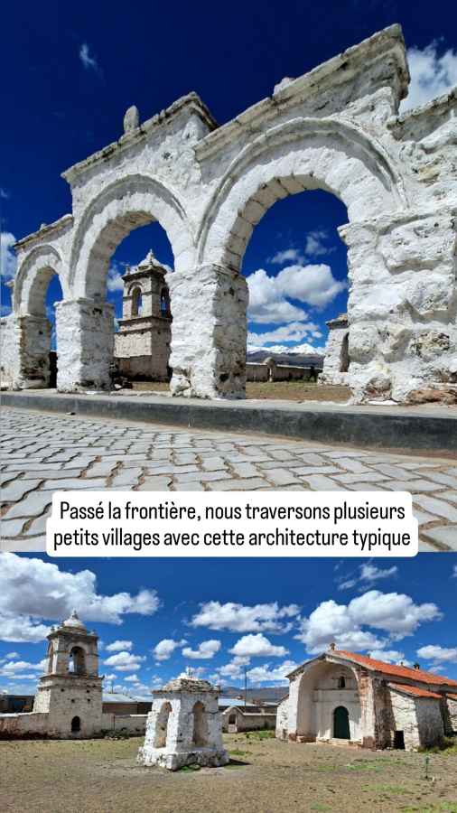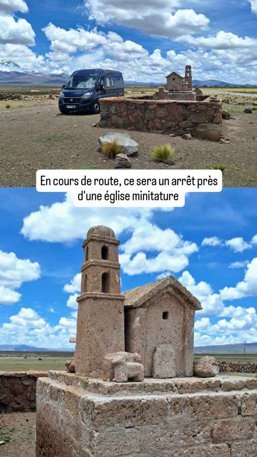 Nous gagnons rapidement le village situé juste après la frontière pour tenter (en vain) d’y acquérir quelques fruits et légumes et acheter (avec succès) une carte SIM locale pour mon téléphone, SOSH ne couvrant pas la Bolivie. La puce me coûte 5 € (50 bob, la monnaie bolivienne au nom sympathique) et autant pour un forfait illimité de 12 jours que je pourrai renouveler si besoin. Plutôt pas cher. Déjà autour de nous, nous voyons circuler de nombreuses femmes en tenue traditionnelle avec chapeau rond, tresses et ample jupe plissée multicolore. Ça promet ! Côté paysage, bien que nous n’ayons fait que franchir un col, le changement est important aussi. Nous sommes dans l’altiplano, de grandes étendues planes entourées de superbes montagnes. Sur parfois un gazon vert tendre ou plus souvent des petits buissons en forme de flamme à perte de vue paissent tranquillement des centaines de lamas, vigognes ou alpagas. Avec beaucoup de petits qu’on aurait envie de prendre dans ses bras si ce n’était une certaine appréhension de la réaction haddockienne des parents. Et puis cet autre volcan majestueux, encore plus haut que le précédent avec ses 6 542m. Le Sajama est d’ailleurs le point culminant de la Bolivie. Nous nous arrêtons pour déjeuner dans un autre petit village appelé Lagunas, charmant avec son église de style andin sur sa place centrale. Et puis nous roulons vers notre prochaine destination : Oruro. La route est plutôt bonne et la portion qui n’était pas asphaltée s’avère cimentée. Nous ne sommes interrompus que par deux péages (environ 1 € à chaque fois) et un points de contrôle où il faudra montrer les tickets de péage. Heureusement que nous les avions gardés ! Nous terminons la journée sur un petit chemin de traverse dans une zone riche en cactus et en chullpas, les tours funéraires que construisaient les Aymaras pour abriter les restes momifiés de certains membres de leur communauté. Curieux petits édifices en adobe munis d’une porte triangulaire sur leur façade Est. Encore du typique. Au total de premières impressions trèèès favorables !
