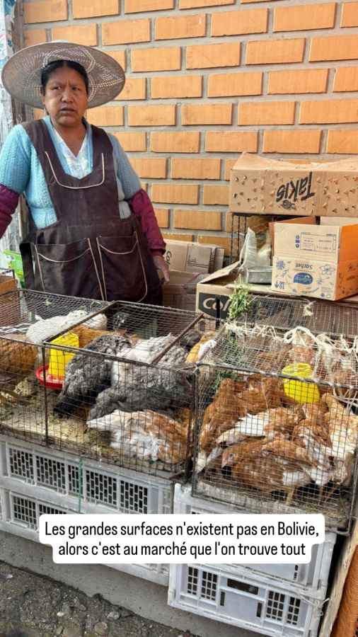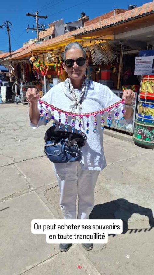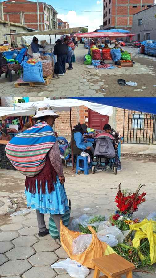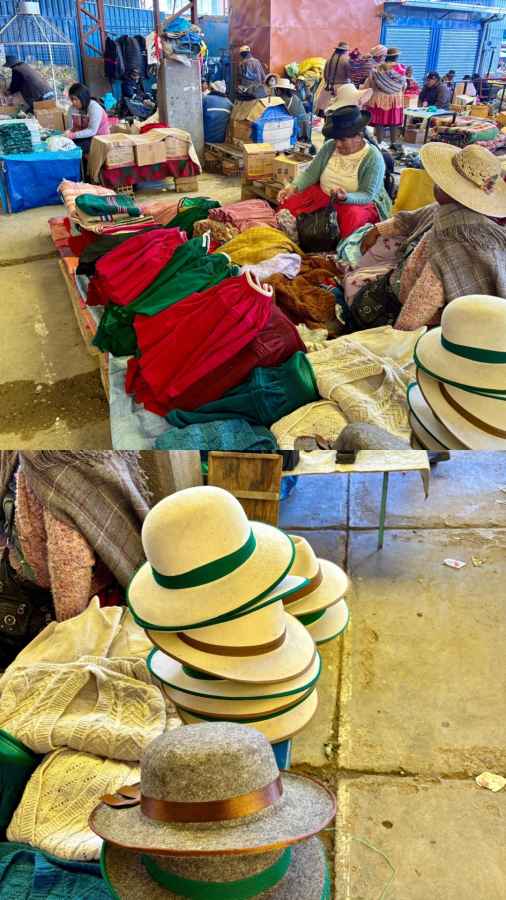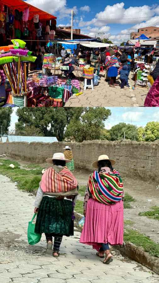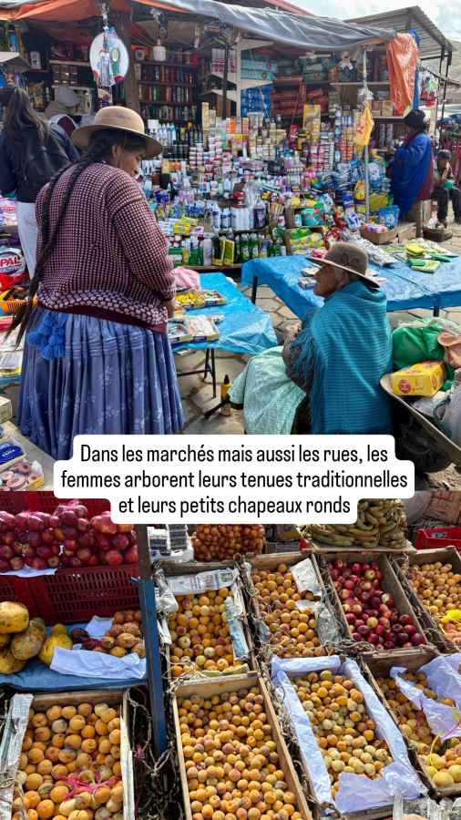 Découvert par hasard dans la petite ville de Challapata où nous avons fait étape pour la nuit, il nous réconcilie d’emblée avec le pays. Pittoresque, coloré, animé, c’est un enchantement et un dépaysement total, grâce notamment aux cholitas, ces femmes boliviennes qui ont su garder leur tenue traditionnelle : petit chapeau rond, tresses, vêtements multicolores tissés et triple ou quadruple jupon de laine qui leur donne une allure inimitable. Cela nous rappelle un peu le Guatemala, où les tenues permettaient d’identifier, sinon l’ethnie, le village d’origine de ces femmes, et ceci hors de toute pression touristique.