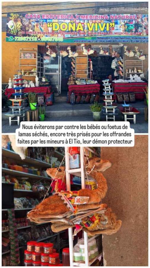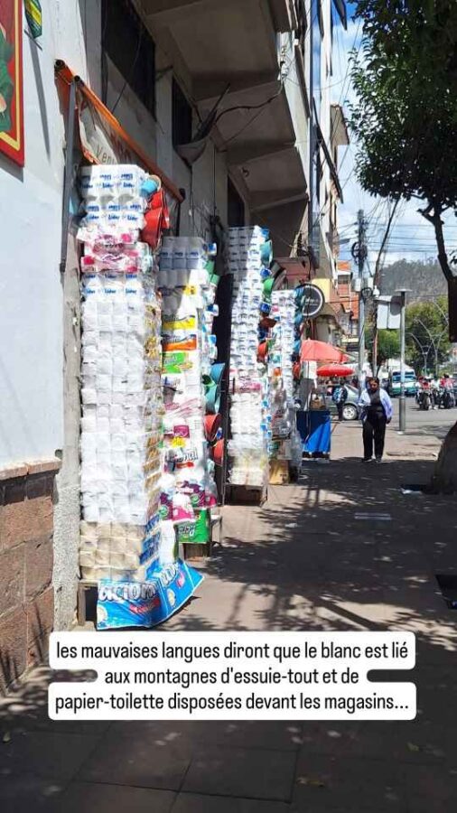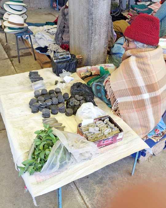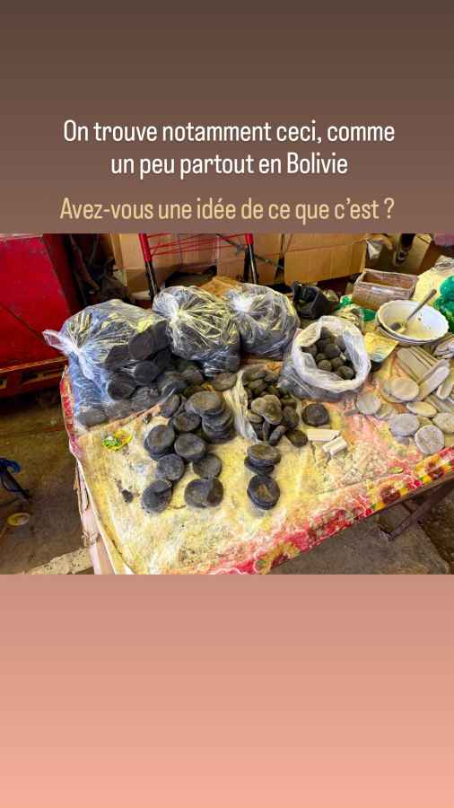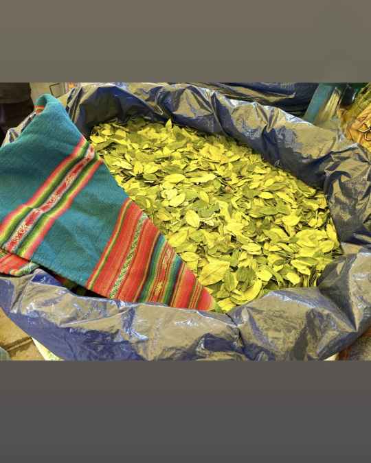 Dans ce marché et dans d’autres après, un commerce insolite est très répandu : celui de la feuille de coca disponible dans de gros sacs en toile de jute parfois ornés de tissus aux motifs autochtones, que les vendeurs détaillent en sacs plastiques comme ceux que l’on trouve de moins en moins dans nos supermarchés. La production, la vente et l’usage de la coca sont autorisés en Bolivie, mentionnés dans la constitution et encadrés par une loi de 2017 sous l’impulsion du président d’alors Evo Morales, lui-même président du puissant syndicat des producteurs de coca. Outre le côté traditionnel et culturel qui remonte aux Incas, mastiquer des feuilles de coca aide les travailleurs à trouver le surplus l’énergie nécessaire dans les environnements de haute altitude où l’oxygène est raréfié. Accessoirement, les tourismes en consomment pour prévenir ou soigner le mal des montagnes ou plus simplement pour donner l’air de s’encanailler. La tradition c’est tout à fait honorable, d’autant que la plante à l’état naturel ne crée apparemment pas de dépendance. Le seul problème est que 2/3 de la production est transformé en cocaïne.