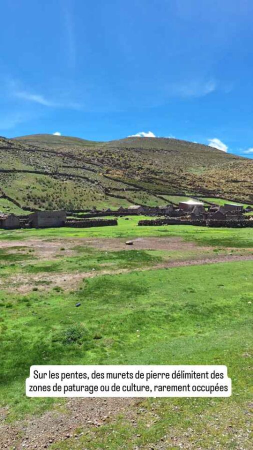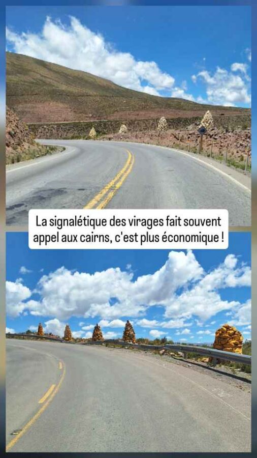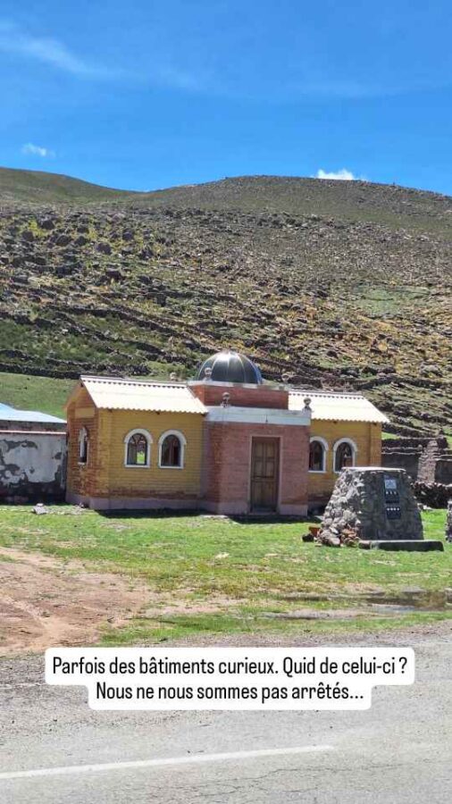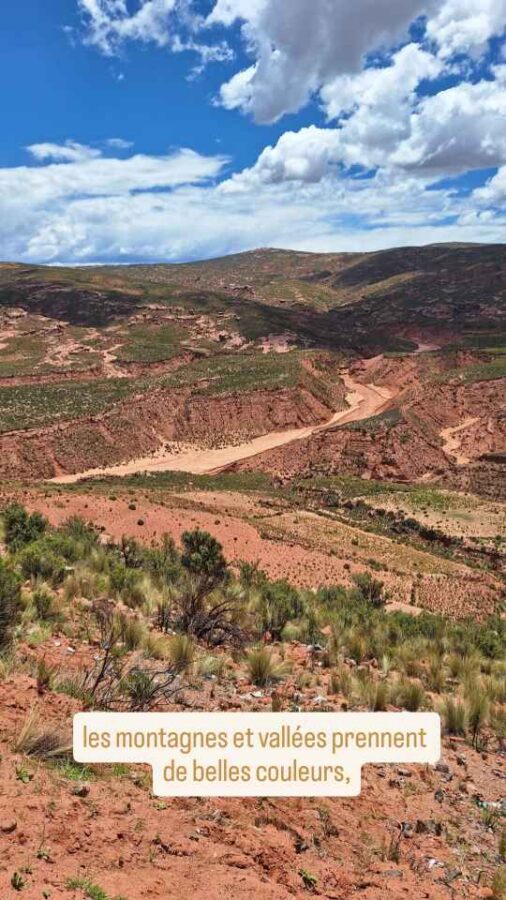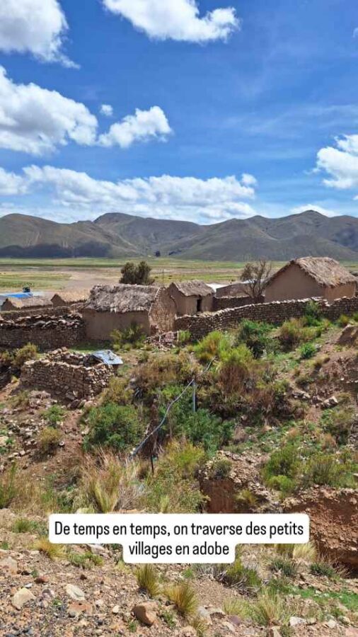 À partir de Challapata, la route s’embellit de kilomètre en kilomètre. Les montagnes prennent de jolies couleurs. Les lamas nous saluent du bord des routes où ils se rassemblent comme si la végétation avait précisément là bien meilleur goût que quelques mètres en retrait, au point de justifier le danger de se faire renverser à tout moment. Des murets de pierres dessinent de jolis motifs géométriques sur les reliefs, sans doute placés là pour délimiter des parcs à animaux d’élevage, ce que nous n’avons pu confirmer qu’une seule fois malgré la multitude des emplacements observés. Peut-être qu’ils étaient davantage utilisés par les autochtones avant qu’ils ne subissent la pression espagnole ? Et puis nous voyons pas mal de petites maisons en adobe, la construction par excellence à la campagne. Beaucoup semblent inhabitées d’ailleurs, mais il est vrai qu’une maison en adobe, soit ça s’entretient, soit ça se jette… Dans certains villages traversés, nous avons pu observer des danses traditionnelles animées par quelques musiciens. Ce serait assez courant. Ambiance typique garantie en tout cas.