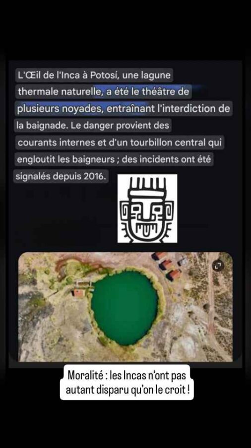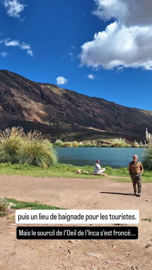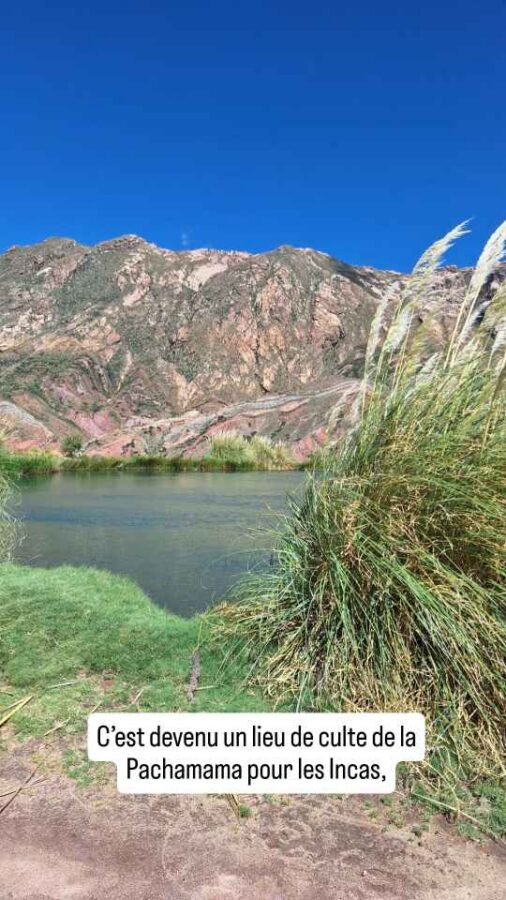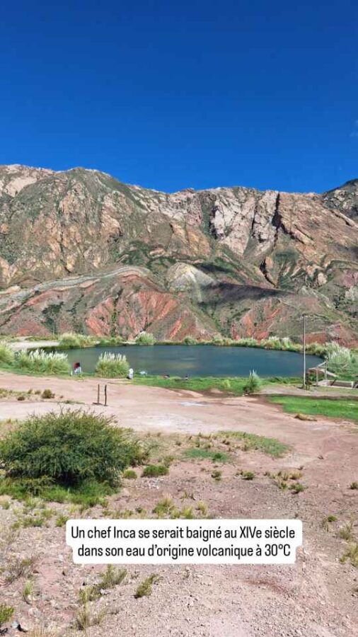 Toujours dans cette région aux superbes montagnes multicolores, nous approchons d’un lieu un peu particulier appelé « l’œil de l’Inca ». Il s’agit d’un tout petit lac circulaire d’à peine 100 m de diamètre au fond duquel jaillit une source chaude. Un chef Inca aurait découvert le lieu au XIVe siècle et s’y serait baigné pour soulager quelque problème de santé. C’est après cette visite qu’il aurait fait retravailler les berges du lac pour qu’elles forment un cercle presque parfait, digne de convertir l’endroit en lieu de culte de la Pachamama et autres divinités inca. Voilà pourquoi l’œil de l’Inca surveille maintenant tous ceux qui passent. C’est peut-être lui qui génère régulièrement des tourbillons qui aspirent régulièrement des touristes venus profiter de l’eau à 30°C. Après quelques décès par noyade, le lieu est désormais interdit à la baignade et le gardien se targue d’un diplôme de maître-nageur sauveteur. Deux précautions valent mieux qu’une !
