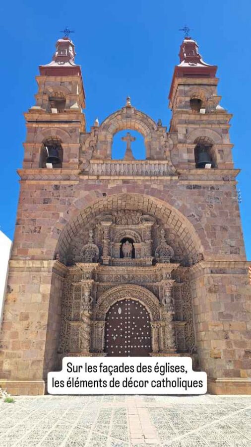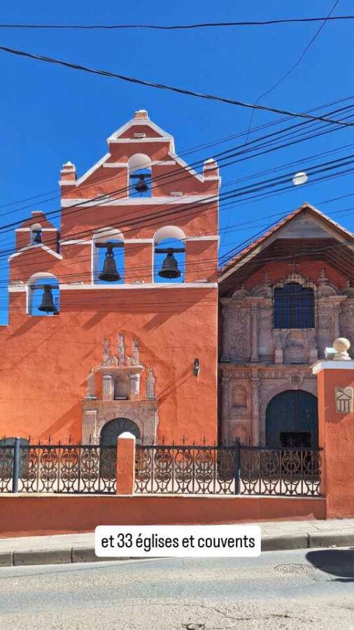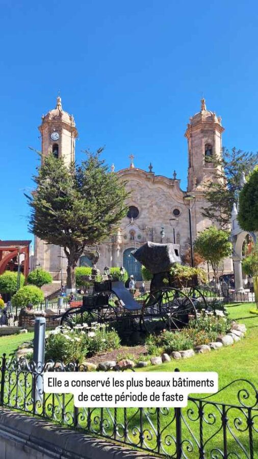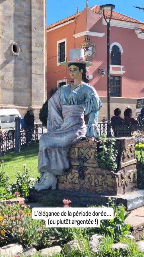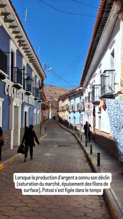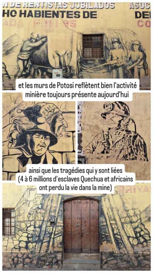 Ce n’est pas moi qui le dis, c’est un professeur d’anthropologie qui a qualifié ainsi la plus célèbre ville minière de Bolivie. Car dès la fin du XVIe siècle, ce qui était alors le plus grand gisement d’argent du monde, exploité par l’Espagne impériale grâce au travail forcé des esclaves Quechua et africains, a financé la conquête du Nouveau Monde et alimenté la Renaissance européenne. Dès 1600, l’argent bolivien avait multiplié par 8 la masse monétaire en circulation en Europe. Cet afflux massif a malheureusement (pour la ville et pour les Espagnols) entraîné un déclin économique rapide au XVIIe siècle, aggravé par le fait que l’épuisement des filons de surface, les plus accessibles, rendait l’exploitation plus compliquée. La mine est toujours en activité bien que de façon moins effrénée qu’auparavant et curieusement exploitée par des Quechua malgré les millions de leurs ancêtres engloutis dans les entrailles du Cerro Rico (la montagne riche). Après avoir lu les conditions difficiles et dangereuses de la visite, appréhendé le côté voyeur et intrusif dès lors que l’on s’introduit dans une entreprise en activité, nous avons renoncé à visiter la mine. Mais Potosi a beaucoup d’autres attraits. Le déclin économique a figé la ville dans son architecture coloniale espagnole avec les beaux bâtiments construits par tout ceux qui vivaient de la ruée vers l’argent et les 33 couvents et églises dans lesquels ils venaient prier pour que ça continue. Tout ça est classé au patrimoine mondial de l’UNESCO.