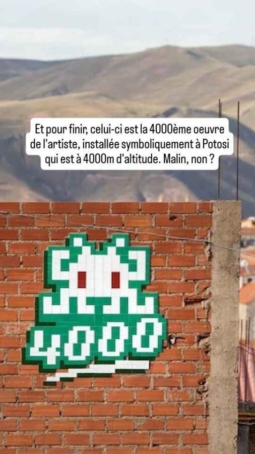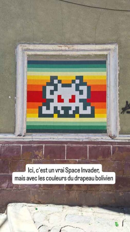 Dans toute l’Amérique du Sud, seules deux villes partagent un privilège très spécial : Potosi et Sao Paulo. Toutes deux et seulement elles ont été « envahies » par notre artiste français Invader. C’est-à-dire qu’il y a apposé un certain nombre de mosaïques dans les rues sur le thème de base des Space Invaders mais généralement personnalisé pour chaque ville. Si vous êtes lecteur(trice) régulier(ère) du blog, vous savez que Claudie et moi faisons partie des chasseurs de ces œuvres d’art, utilisant notamment l’application dédiée. C’est en 2022 que Invader s’est rendu à Potosi pour y installer 53 de ses œuvres, dont la 4000ème de sa carrière, un symbole pour une ville située à 4000m d’altitude. Nous nous sommes contentés d’en flasher une douzaine, ce qui n’est pas si mal. Nous avons apprécié d’y retrouver les éléments caractéristiques de Potosi : Cerro Rico, condors, cholitas, mineurs, lamas, etc.