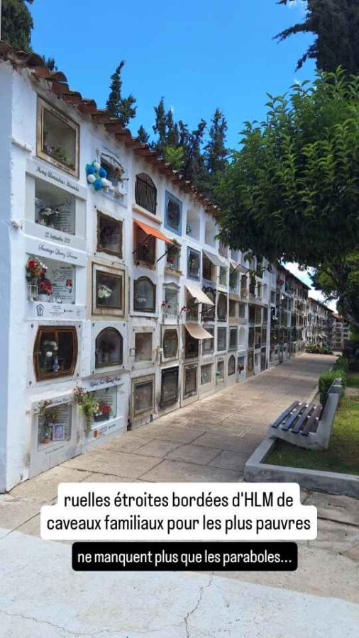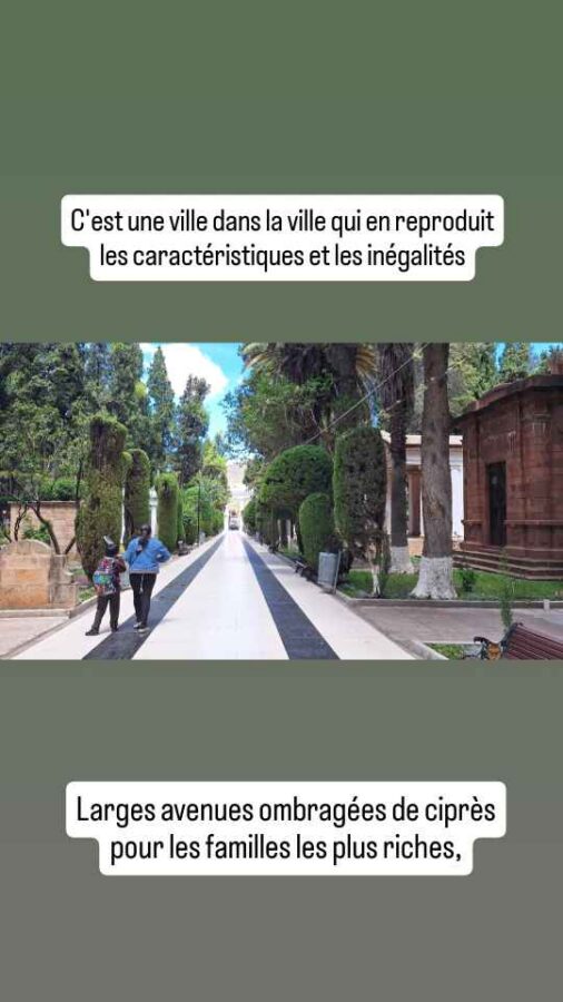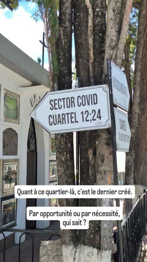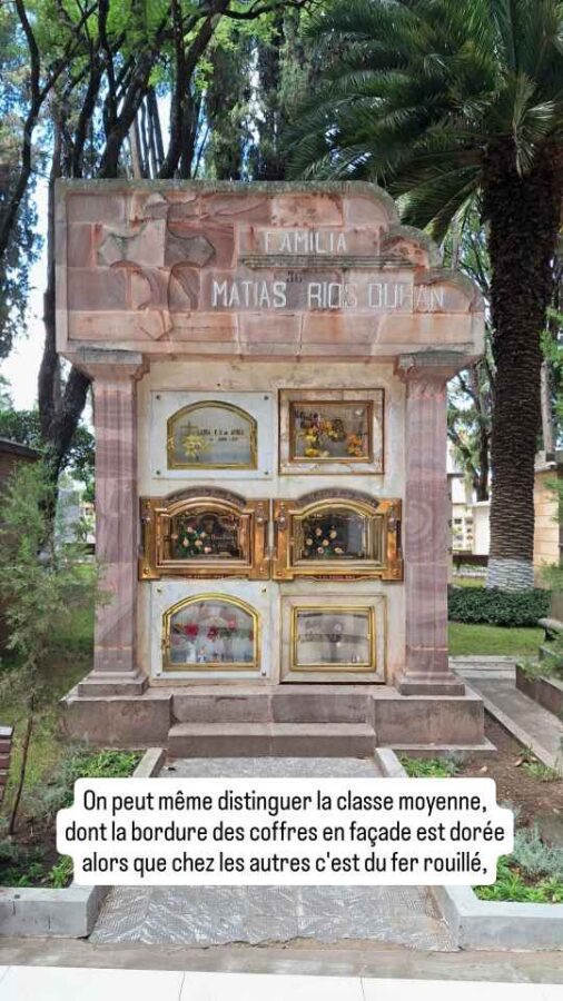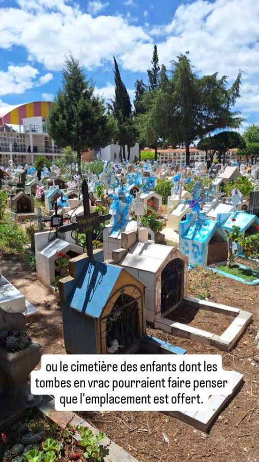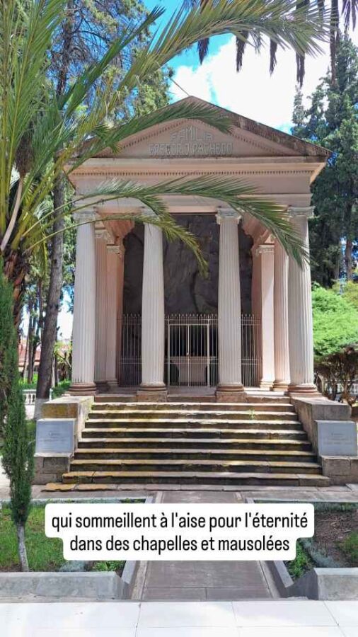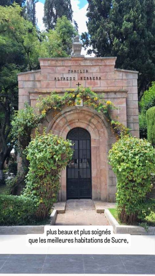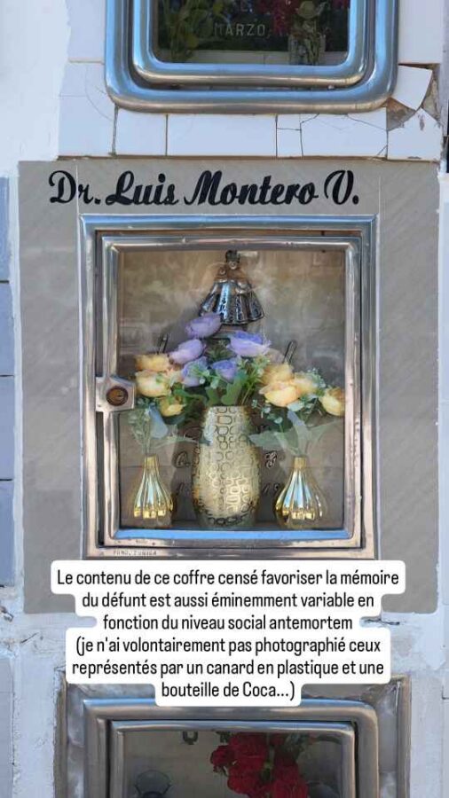 On met un peu à part la visite du cimetière général de Sucre, une sorte de ville dans la ville qui en reproduit toutes les particularités, souvent même en mieux : rues et avenues tracées au cordeau, végétation abondante et bien entretenue, chapelles et mausolées plus somptueux que la plupart des habitations de la ville. De la ville on reproduit ici hélas aussi les inégalités criantes : les défunts riches sommeillent pour toujours à l’aise dans de larges et beaux bâtiments, tandis que les pauvres sont entassés dans des caveaux familiaux disposés dans des sortes d’HLM en béton bordant des ruelles étroites. Même dans la pauvreté on fait des distinctions avec le coffre vitré apposé en façade, au cadre zingué à doré en fonction des revenus et dont le contenu censé évoquer la mémoire du défunt varie énormément selon le niveau social antérieur de celui-ci. A noter que les Boliviens procèdent en 2 étapes pour les sépultures : d’abord un enterrement comme en majorité chez nous, puis une exhumation du corps 10 jours après pour une incinération. Les urnes peuvent se retrouver dans les petits coffres mais pas toujours.